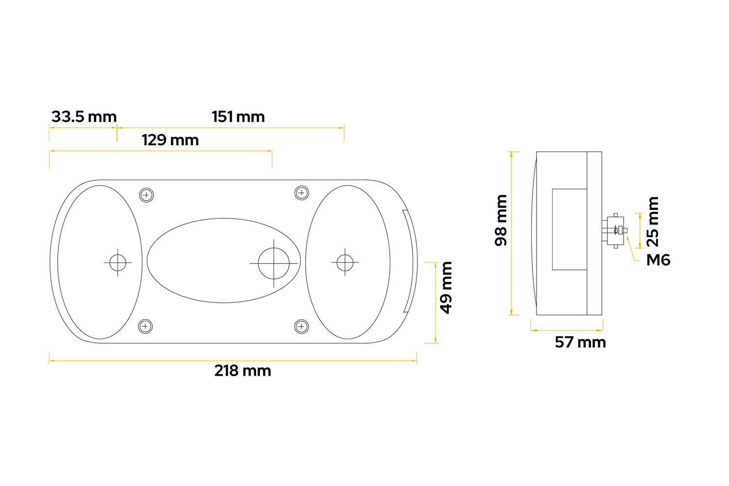 La luz trasera Midipoint II de ASPÖCK está diseñada para instalarse tanto en el lado izquierdo como en el derecho del vehículo y tiene las siguientes dimensiones: ancho 218 mm, alto 98 mm, fondo 57 mm . Equipado con un conector de bayoneta de 5 pines , permite una instalación fácil y rápida en remolques, autobuses y grúas .