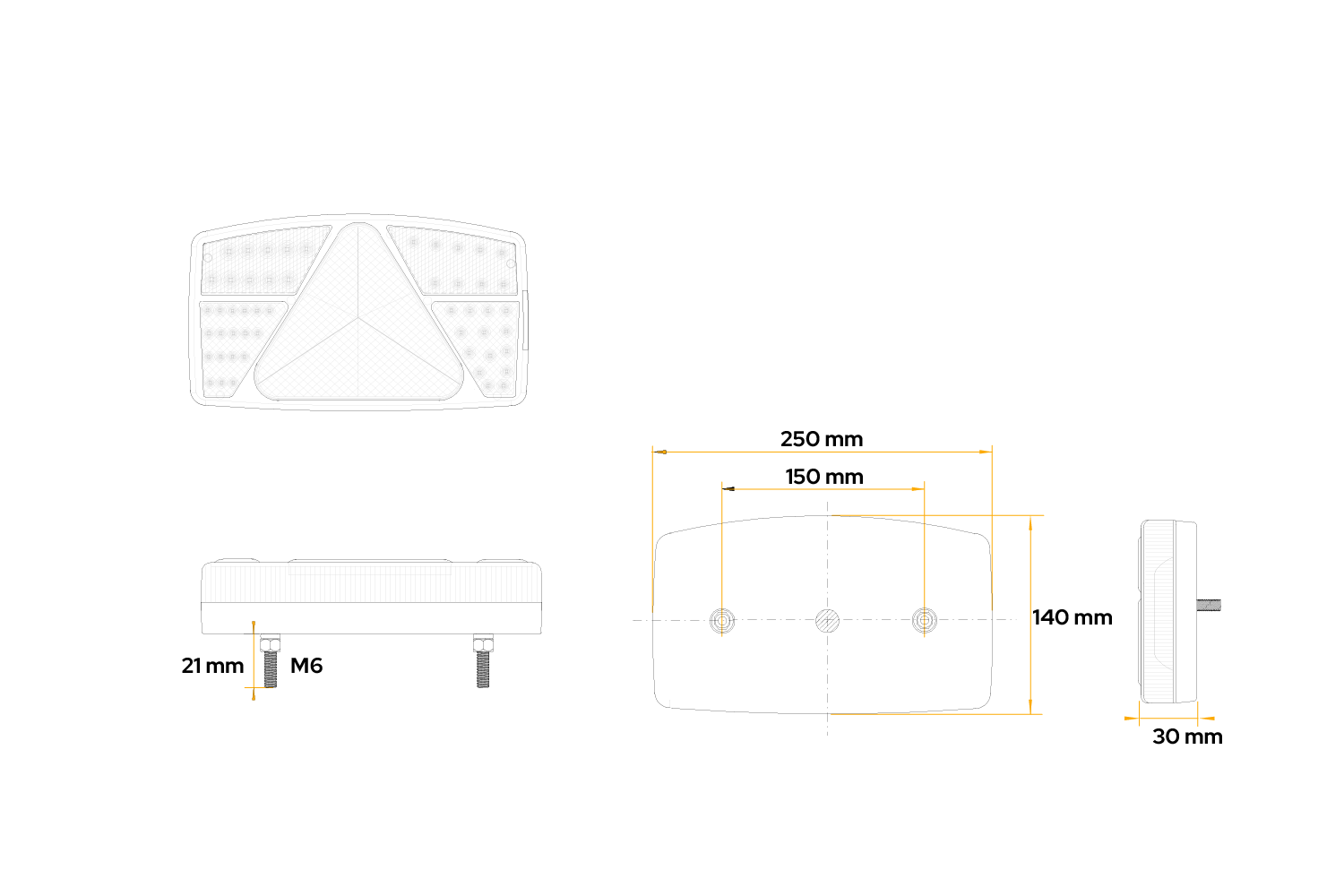 La lámpara tiene siete funciones: luz de posición , que garantiza la visibilidad del vehículo en conducción nocturna; una señal de giro , que permite indicar la intención de girar ; luz de freno , señalización de frenado; luz de marcha atrás , que facilita las maniobras marcha atrás mejorando la visibilidad detrás del vehículo ; luz antiniebla , que aumenta la seguridad en condiciones climáticas difíciles, como niebla o lluvias intensas; un triángulo reflectante que aumenta la visibilidad del vehículo; y una luz de posición , que resalta los contornos exteriores del vehículo, mejorando su visibilidad en la carretera, especialmente de noche y en condiciones de poca luz . La lámpara tiene una clase de estanqueidad IP64 y aprobación E.