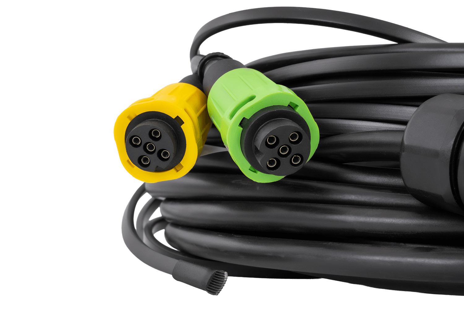 La segunda parte incluye un conector para la barra de luces traseras (p. ej., la que se retira para botar una embarcación). El cable de 1,77 metros termina en conectores de bayoneta de 5 pines para conectar las luces traseras. Con un alto grado de sellado IP67 , ofrece una excelente protección contra el agua, el barro y el polvo, ideal para su uso en condiciones húmedas, como el transporte en barco o el uso todoterreno. Además, el cable cuenta con una derivación integrada para dos cables de 0,35 metros para las luces de posición, que marcan eficazmente las dimensiones del vehículo tanto de día como de noche, mejorando la seguridad durante las maniobras y la conducción en condiciones difíciles.