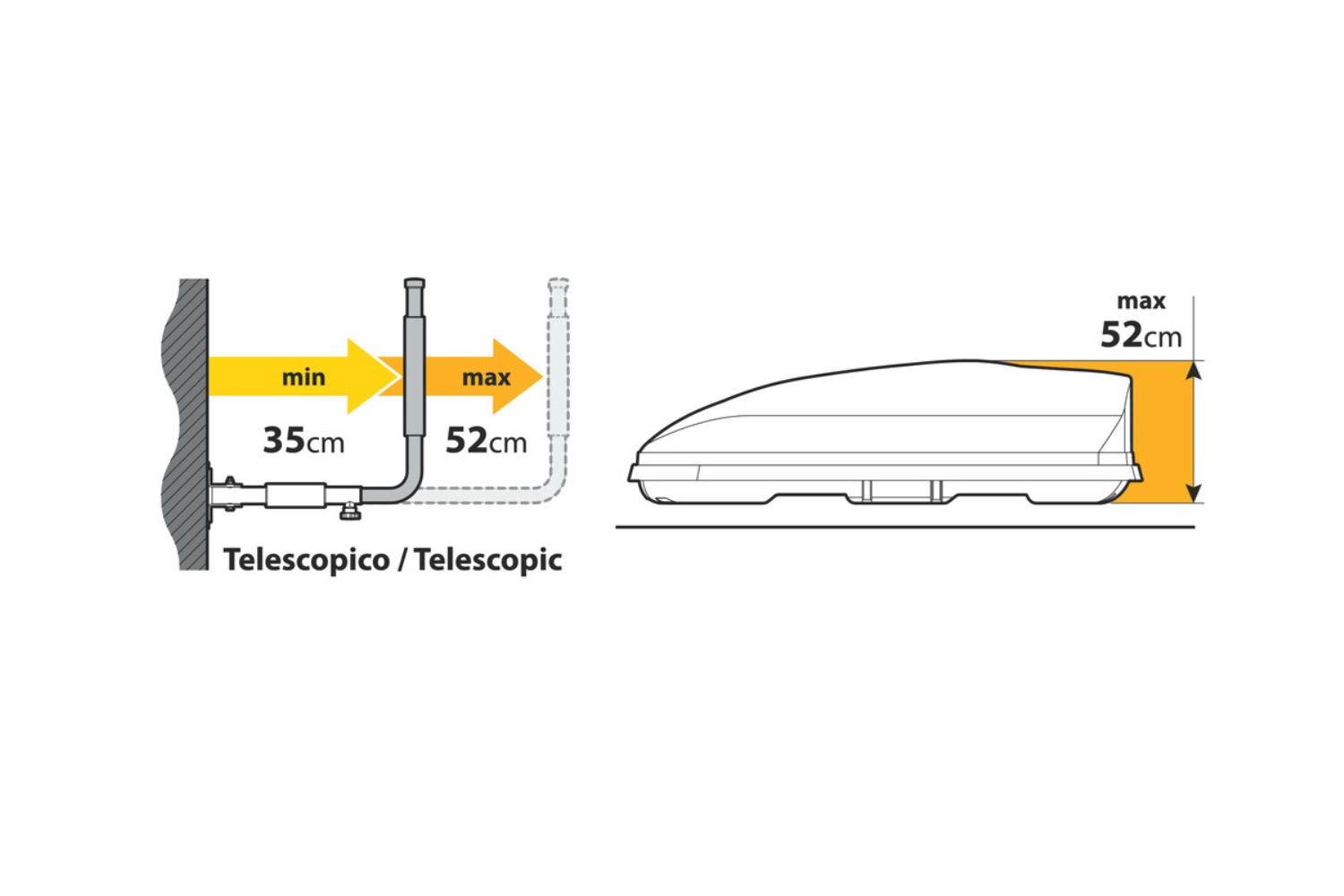 Los soportes de pared para cofres de techo TIPO 1 son prácticos soportes para almacenar el cofre lateralmente, ahorrando espacio y protegiendo el maletero. Su ajuste telescópico de 35 a 52 cm permite una adaptación rápida y sin herramientas a diversos tamaños y formas de cofres. La construcción de tubos de 30/25 mm de diámetro es robusta y estable, y su capacidad de carga máxima de 40 kg permite almacenar la mayoría de los modelos de forma segura.