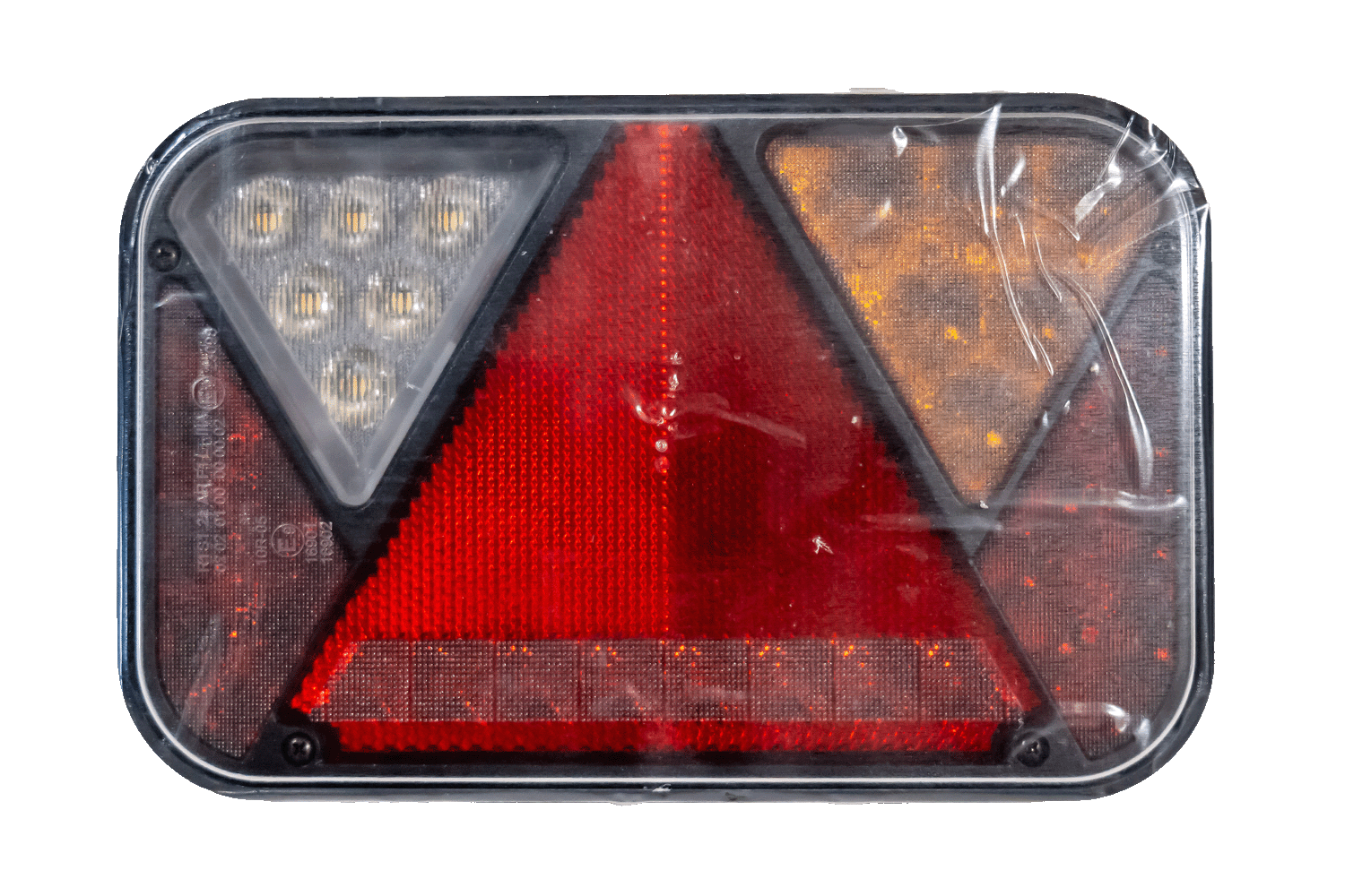 • La luz trasera LED FRISTOM FT-270 está diseñada para montaje en el lado derecho. Incluye luz de posición, luz de freno, direccional, luz de matrícula y un triángulo reflectante.