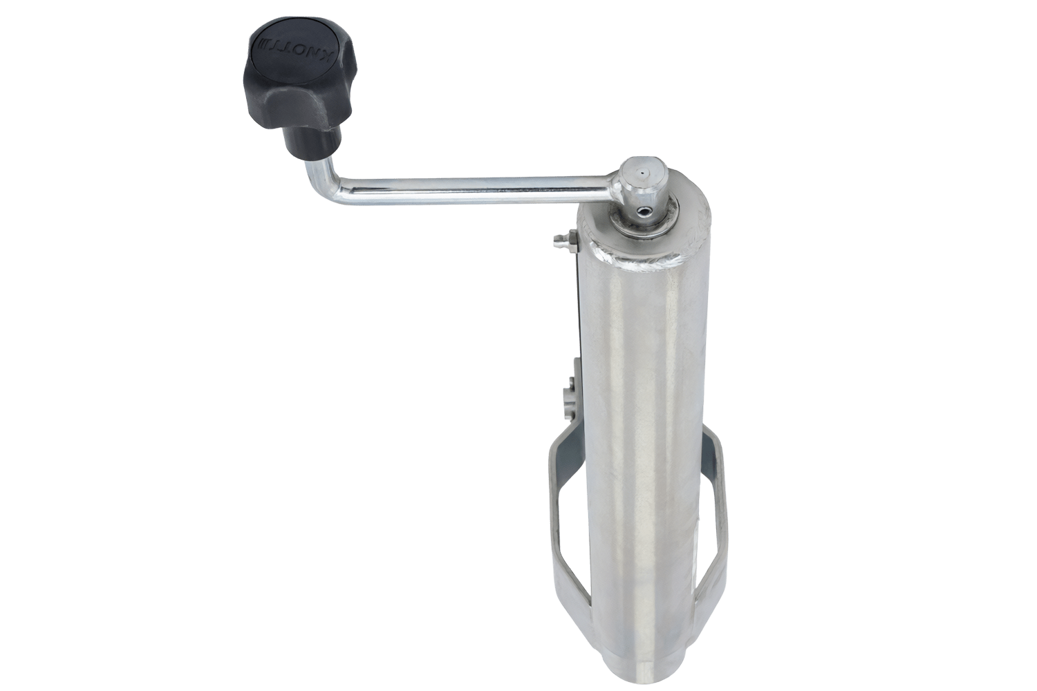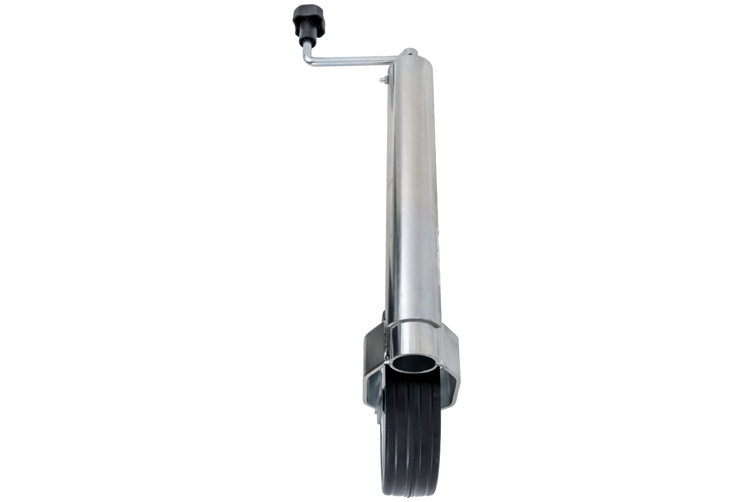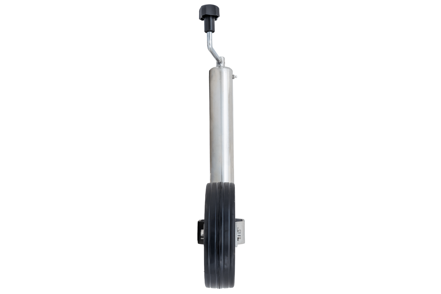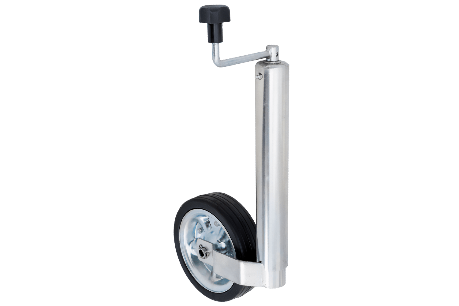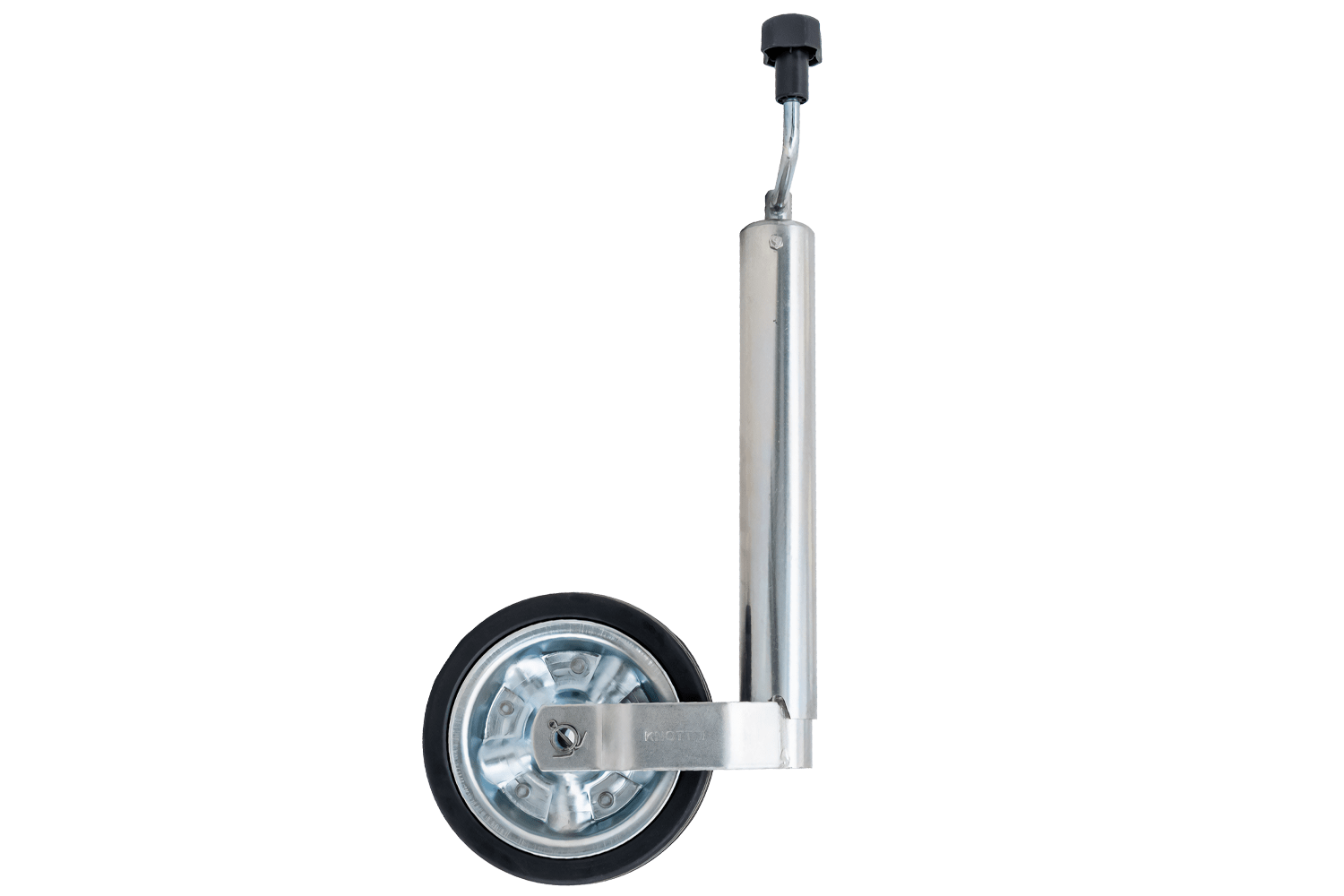 • La rueda jockey TK60, con una capacidad de carga de 250 kg y un diámetro de tubo de 60 mm, estabiliza la barra de tiro del remolque al estacionar y facilita las maniobras. Funciona bien en remolques ligeros y medianos, garantizando un rodaje fiable y una