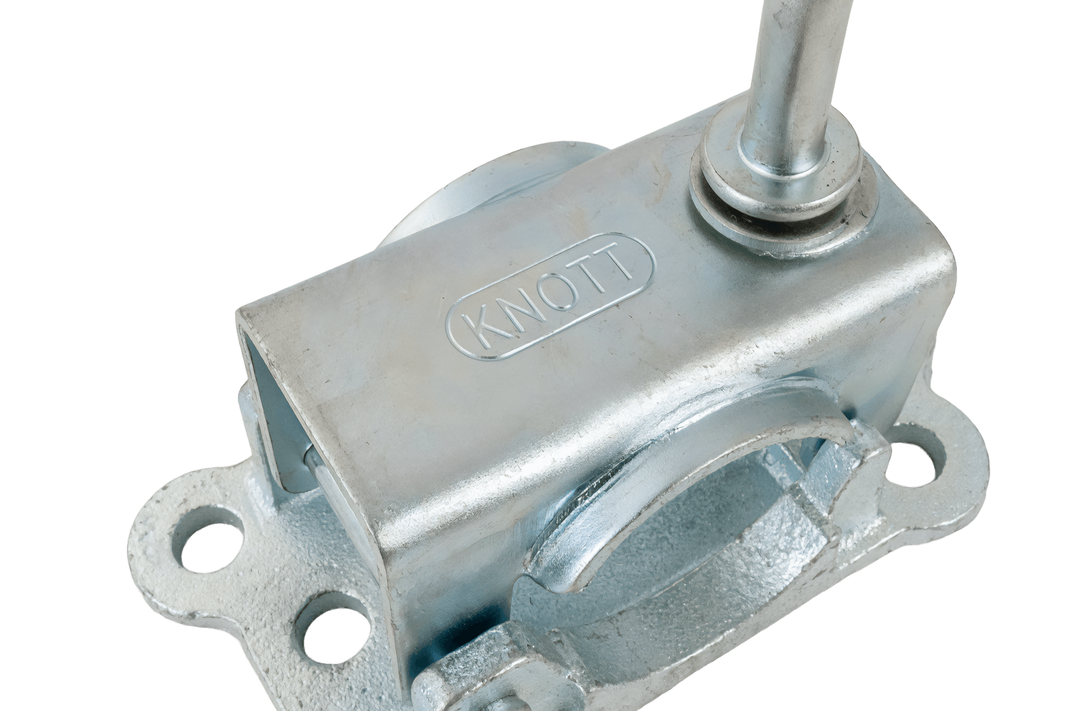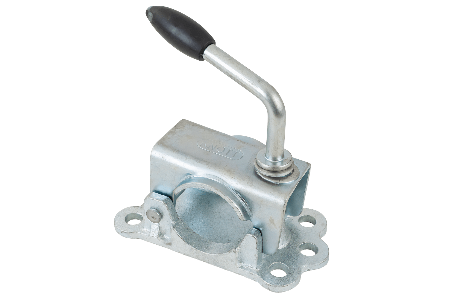 La abrazadera para rueda jockey KNOTT 4802869X se utiliza para montar ruedas jockey con un tubo de 48 mm de diámetro . La base tiene orificios de montaje con una separación de 150 x 50 mm y un diámetro de 11 mm. Permite fijar rápidamente el soporte al chasis o al soporte de la barra de tiro. La palanca de presión garantiza un agarre seguro en el tubo, reduce el deslizamiento y la vibración, y permite ajustar rápidamente la altura de la rueda o desmontarla por completo para su transporte o mantenimiento.