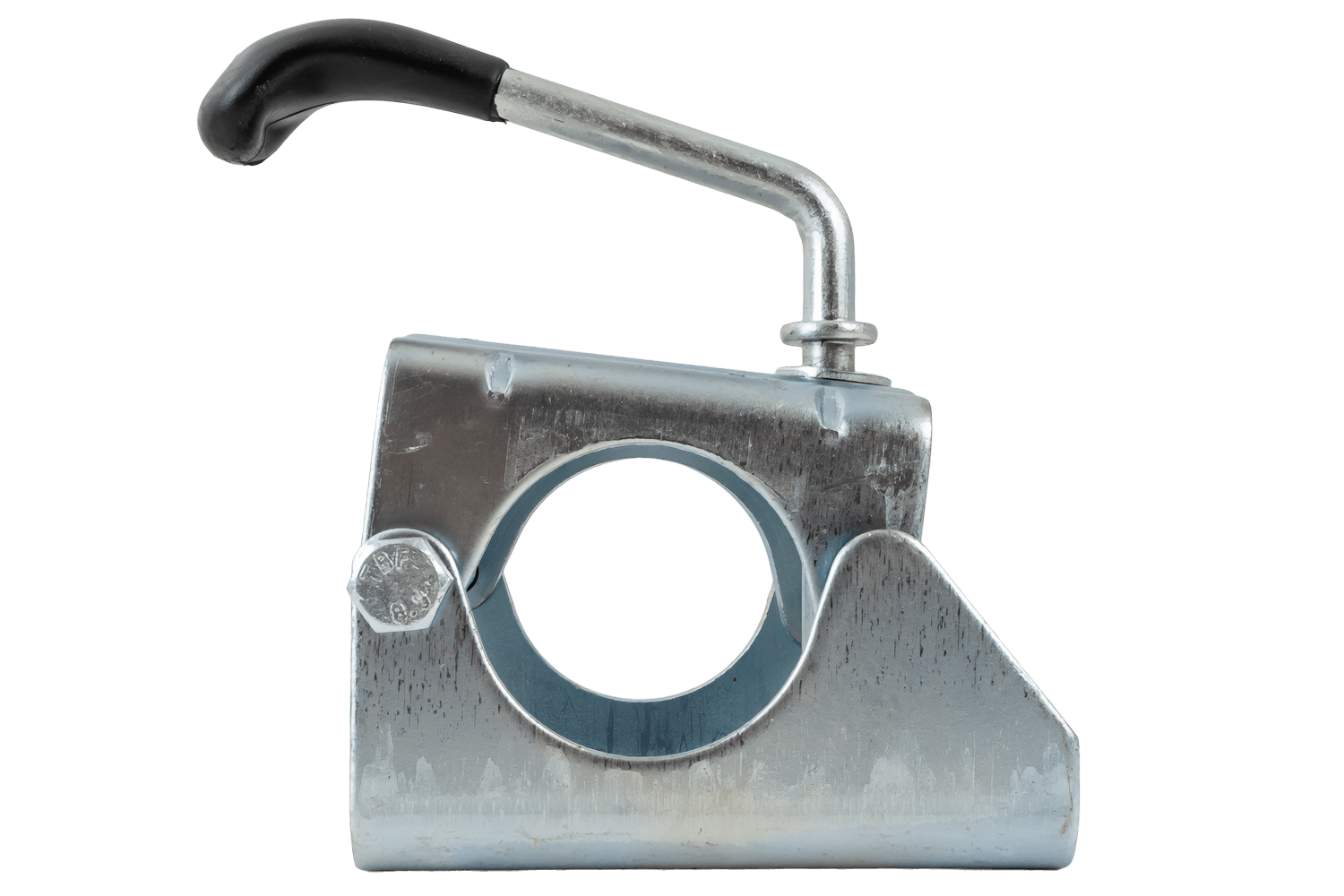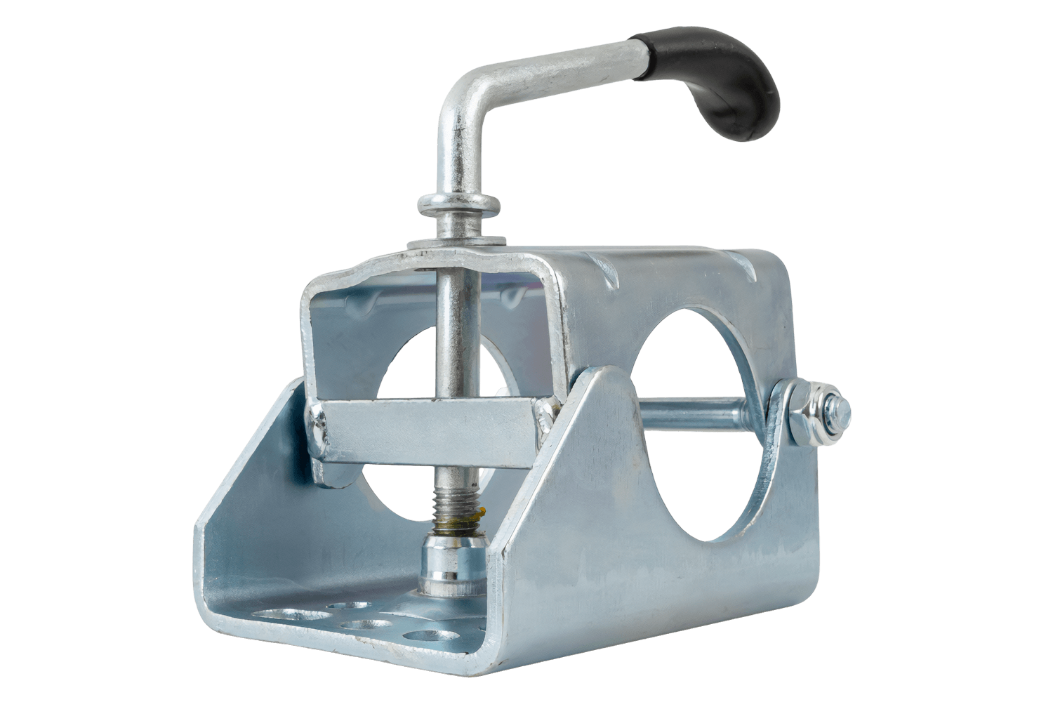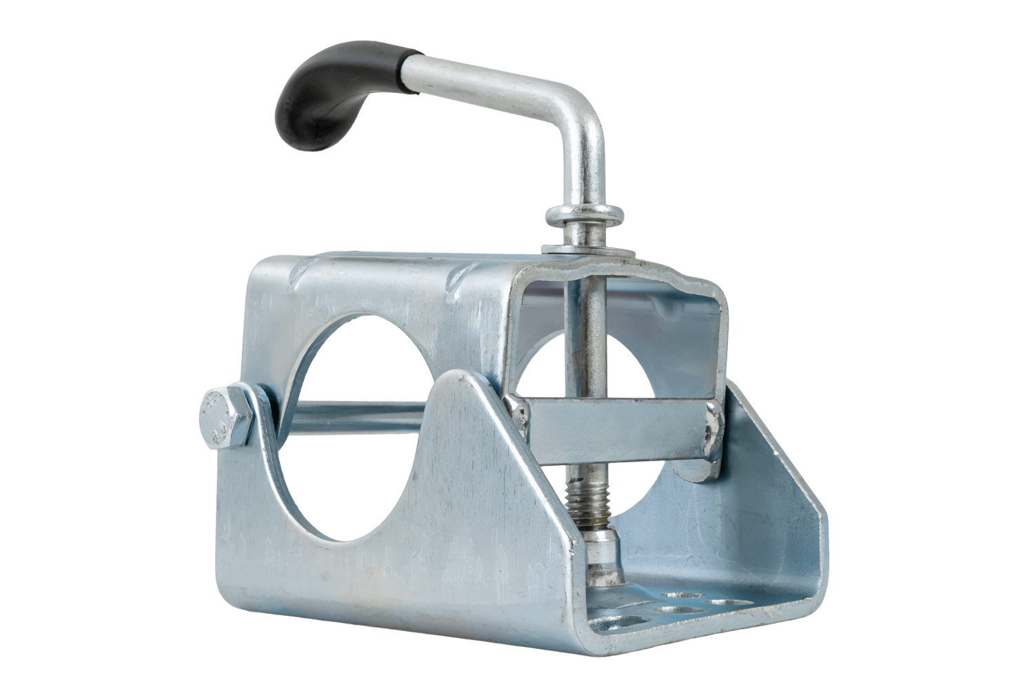 Una rueda jockey con abrazadera se utiliza para sujetar y maniobrar cómodamente la barra de tiro del remolque fuera del vehículo: facilita el acoplamiento/desacoplamiento , la nivelación y el ajuste manual sin riesgo de caída del remolque ni de daños en el enganche. La abrazadera fija la rueda jockey al bastidor/soporte, lo que permite ajustar rápidamente la altura y la posición, o incluso desmontarla por completo. Es una solución ideal para remolques de carga, remolques para embarcaciones y caravanas.