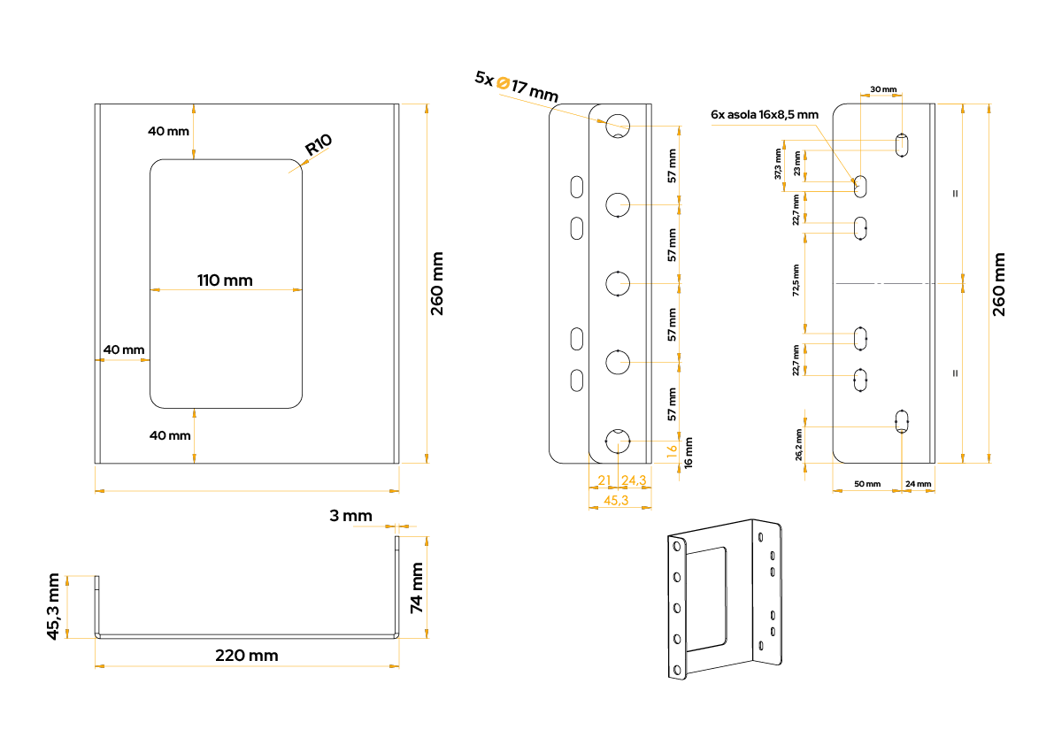 Juego de dos soportes de montaje para cajas de extintor DAKEN 88501. Estos soportes están diseñados para cajas de extintor de las series ADAMANT, REGON y STRIKE . Permiten un montaje seguro de la caja en remolques, plataformas y otros vehículos comerciales , lo que aumenta la seguridad y la accesibilidad a los equipos de extinción de incendios cuando sea necesario. Dimensiones de un soporte: altura 260 mm, profundidad 220 mm .