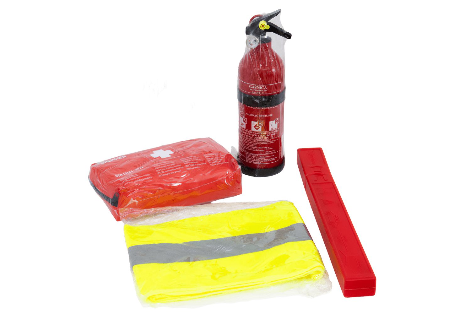 Kit de coche HERMON: botiquín de primeros auxilios, extintor, triángulo, chaleco