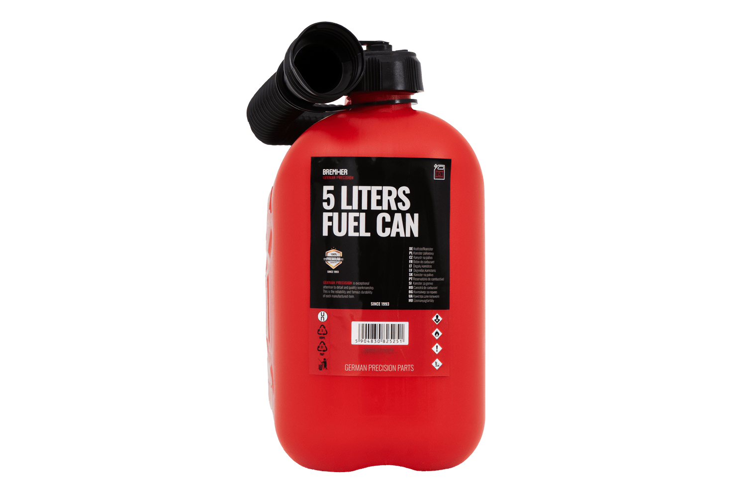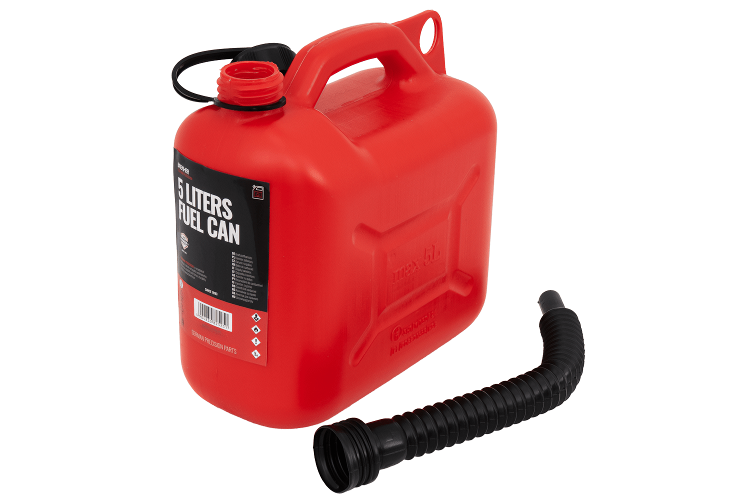 Este bidón de plástico de 5 litros está fabricado con HDPE de alta calidad, resistente a daños mecánicos y productos químicos. Cuenta con un asa ergonómica para facilitar su transporte y un embudo flexible que se enrosca para verter con comodidad y precisión sin derrames.