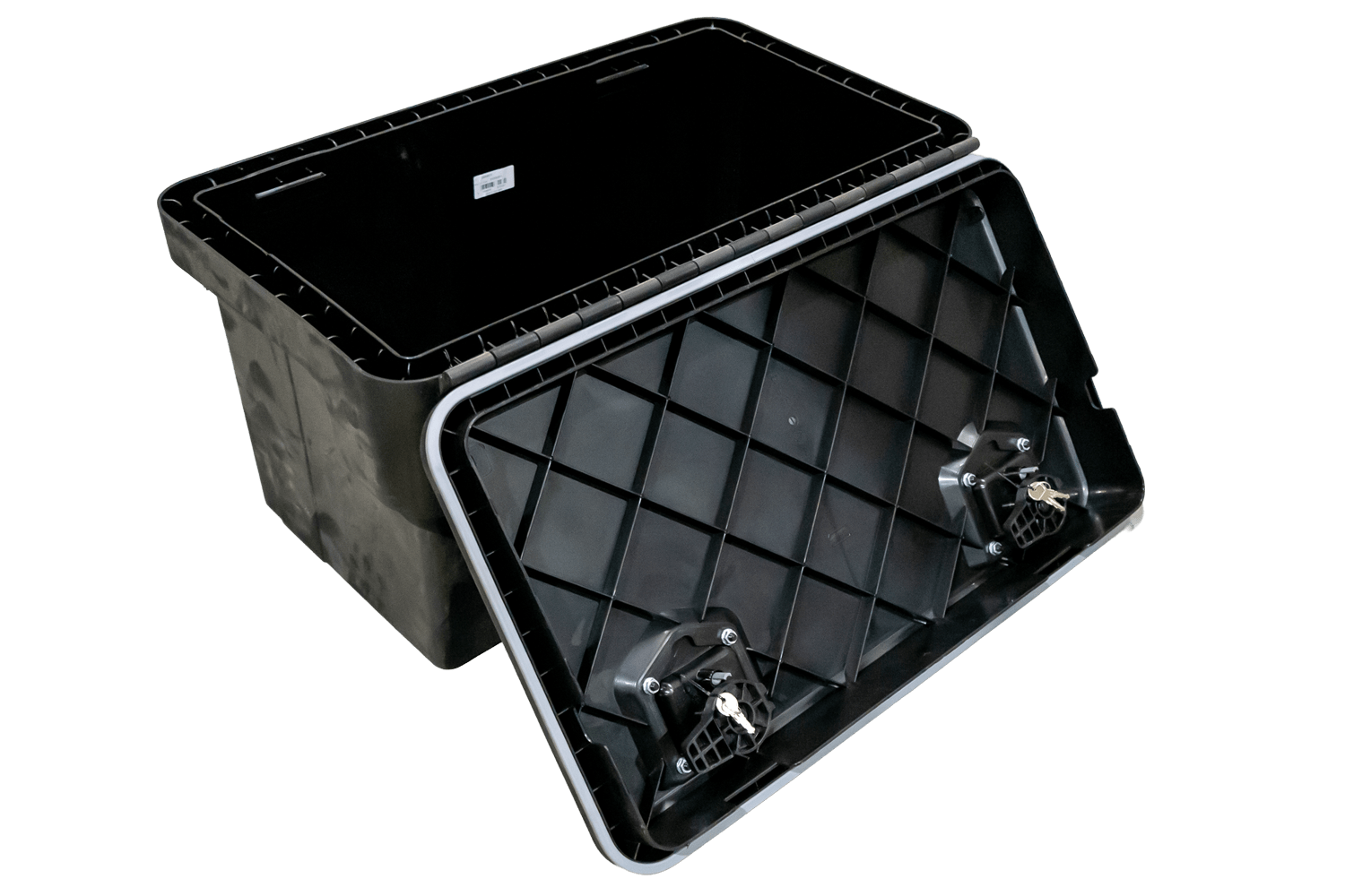 La caja está fabricada con polipropileno y nailon de alta calidad, reforzados con nervaduras para una mayor durabilidad y resistencia a daños mecánicos. Este material ofrece una protección excepcional contra incendios, agua, polvo, combustible, rayos UV y temperaturas extremas , lo que la hace ideal para un uso intensivo en condiciones adversas. La tapa de la caja está equipada con una junta de goma que garantiza una estanqueidad total, impidiendo la entrada de agua y polvo al interior . Este diseño protege eficazmente las herramientas y equipos almacenados de factores externos dañinos, lo cual es especialmente importante para un uso intensivo en obras de construcción o en condiciones climáticas adversas.