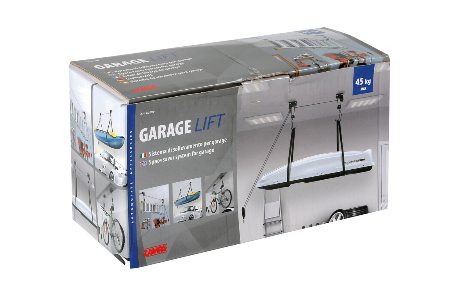 • Garage Lift es un sistema de almacenamiento de techo que libera espacio en tu garaje. Permite colgar cofres de techo, bicicletas y escaleras de hasta 45 kg. Incluye un kit de montaje. Perfecto para mantener tu equipo organizado y protegido.