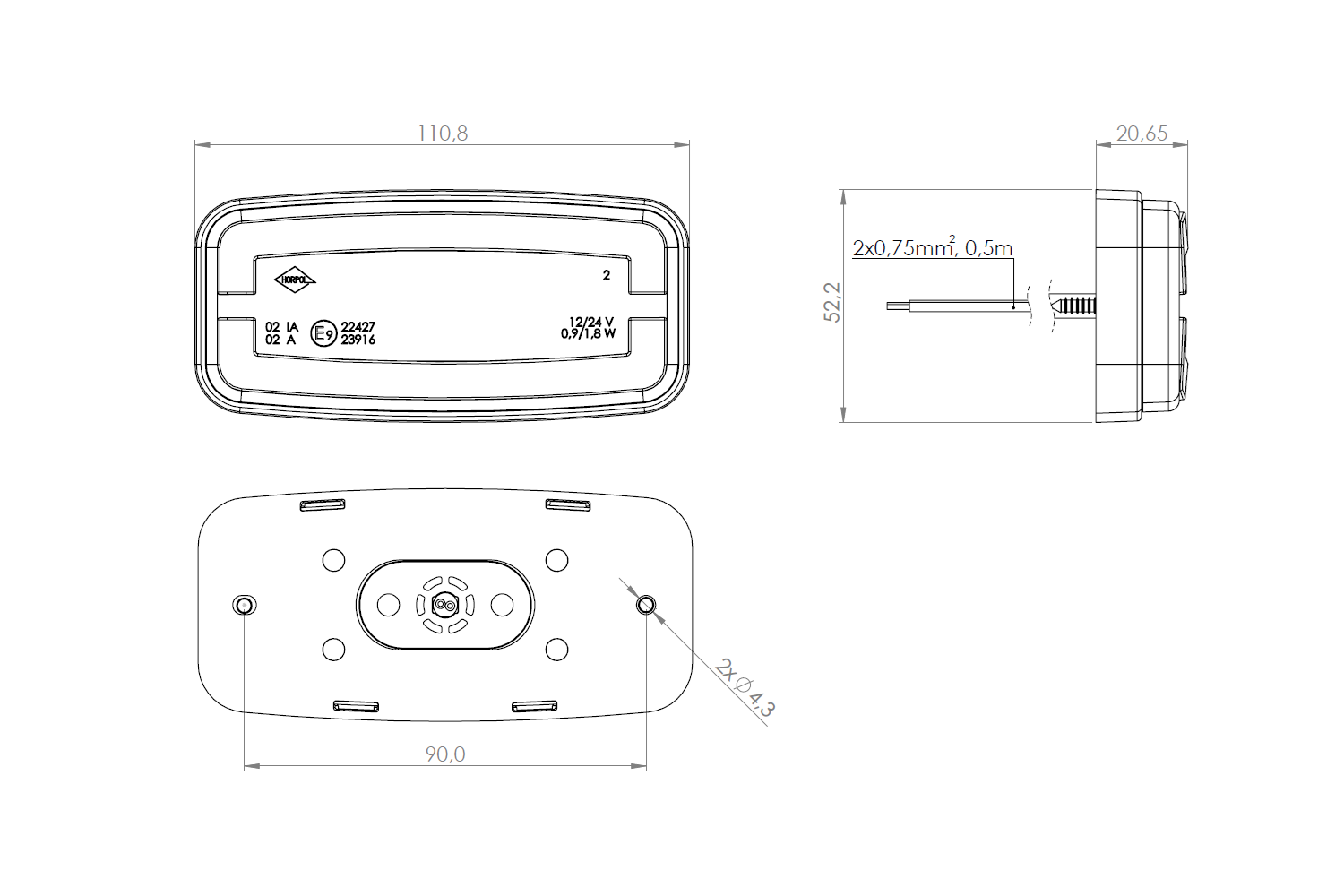 La luz de posición LED LD 2761 de HORPOL, diseñada para su instalación tanto en el lado izquierdo como en el derecho del vehículo , mide 110,8 mm de ancho, 52,2 mm de alto y 20,65 mm de profundidad . Diseñada para funcionar en un rango de voltaje de 12-24 V , es apta para su uso en remolques, maquinaria agrícola, camiones y grúas, lo que destaca su versatilidad. Equipada con un cable plano de 0,5 m , permite una instalación rápida y sencilla. Gracias a la tecnología LED , la luz ofrece un alto rendimiento, durabilidad y eficiencia energética, garantizando la seguridad en diversas condiciones de la carretera. El cuerpo de la luz permite su instalación sin fijaciones visibles.