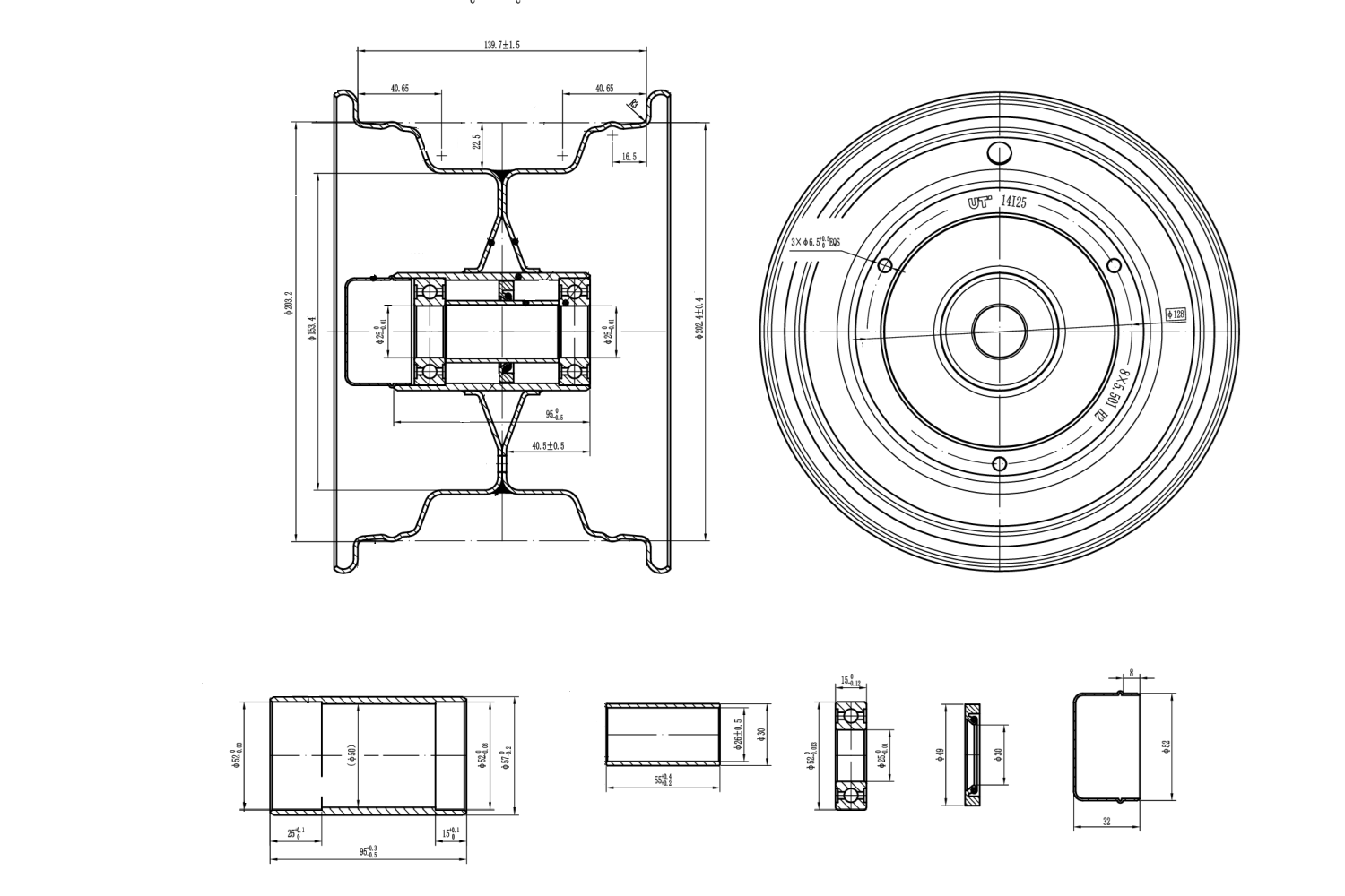 Este modelo está equipado con dos rodamientos sellados 6205-2RS , que garantizan un funcionamiento suave y protección contra el polvo y la humedad. La longitud del buje es de 95 mm , incluyendo aproximadamente 55 mm entre los rodamientos, y el diámetro exterior del buje es de 57 mm . La distancia entre orificios de montaje de 3x128 significa que la llanta tiene tres orificios dispuestos en un círculo de 128 mm de diámetro. La distancia entre los tornillos es un parámetro clave al seleccionar una llanta para asegurar un ajuste correcto al buje del vehículo.
