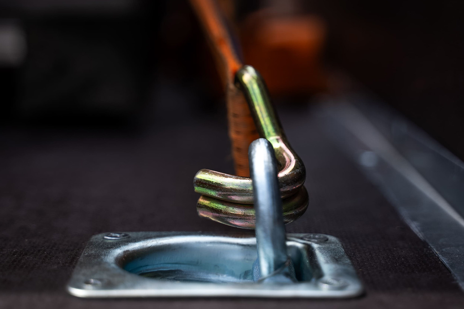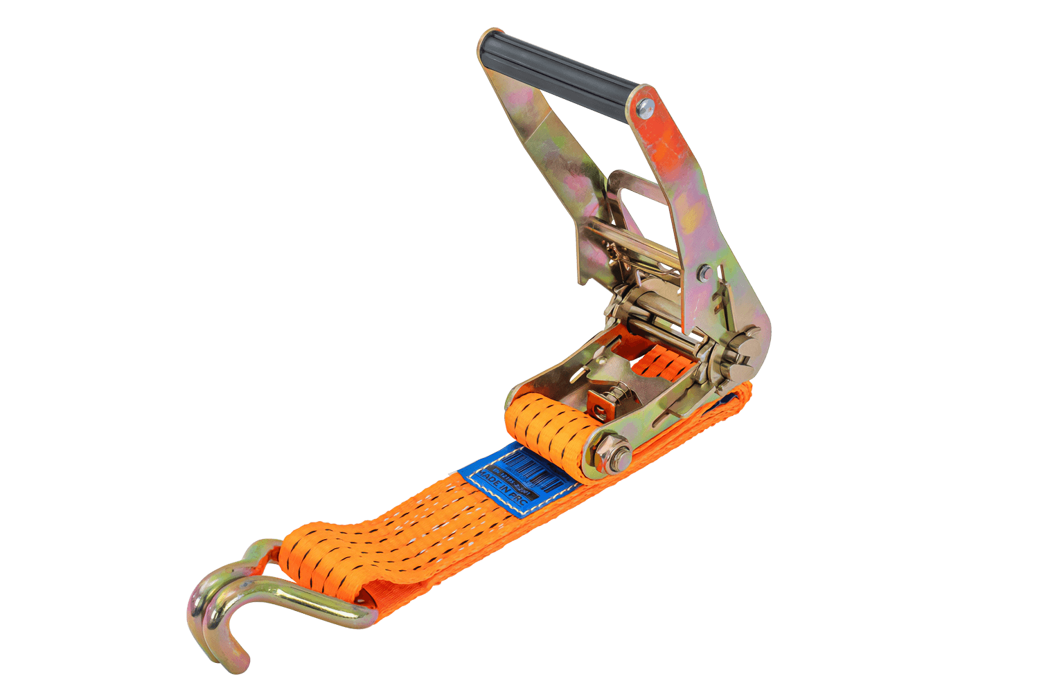 La correa de trinquete naranja UNITRAILER consta de dos partes: una más corta con trinquete y gancho, y una más larga con correa y gancho. La longitud total de la correa, incluyendo la correa y la hebilla, es de 10 metros , suficiente para asegurar cargas más grandes. La correa de 50 mm de ancho proporciona una presión adecuada. La correa tiene una robusta fuerza de tensión de hasta 5 toneladas (5000 daN) , lo que la hace ideal para asegurar cargas más pesadas.