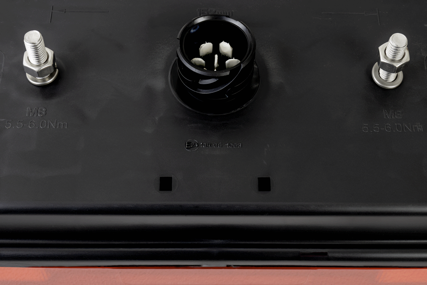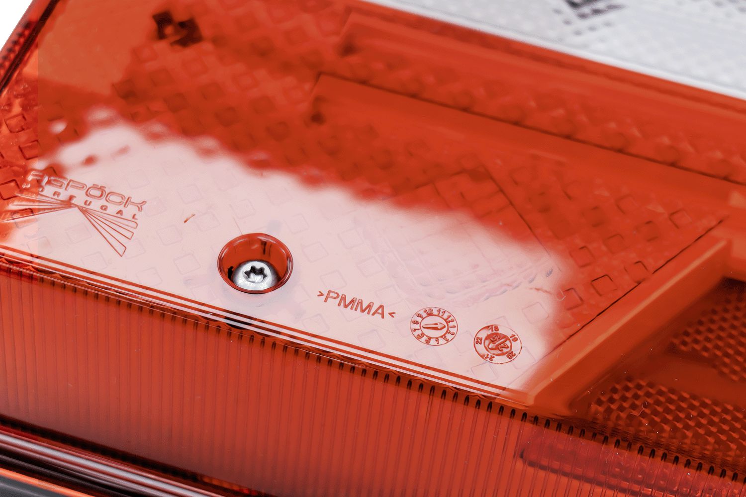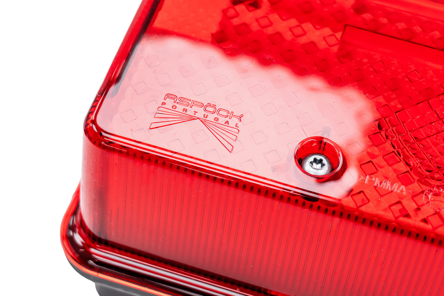 • Piloto trasero Europoint III ASPÖCK para instalación en el lado izquierdo. Ofrece siete funciones: luz de posición, luz de freno, luz antiniebla, luz de marcha atrás, luz de posición lateral, intermitente y reflector.