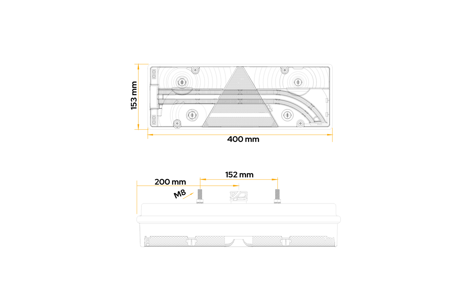 La luz trasera Europoint III de ASPÖCK, destinada a ser instalada en el lado izquierdo del vehículo , tiene las siguientes dimensiones: ancho 400 mm, alto 153 mm, fondo 88 mm . Equipado con un conector ASS2.1 de 7 pines , permite una instalación fácil y rápida en remolques, autobuses y grúas .