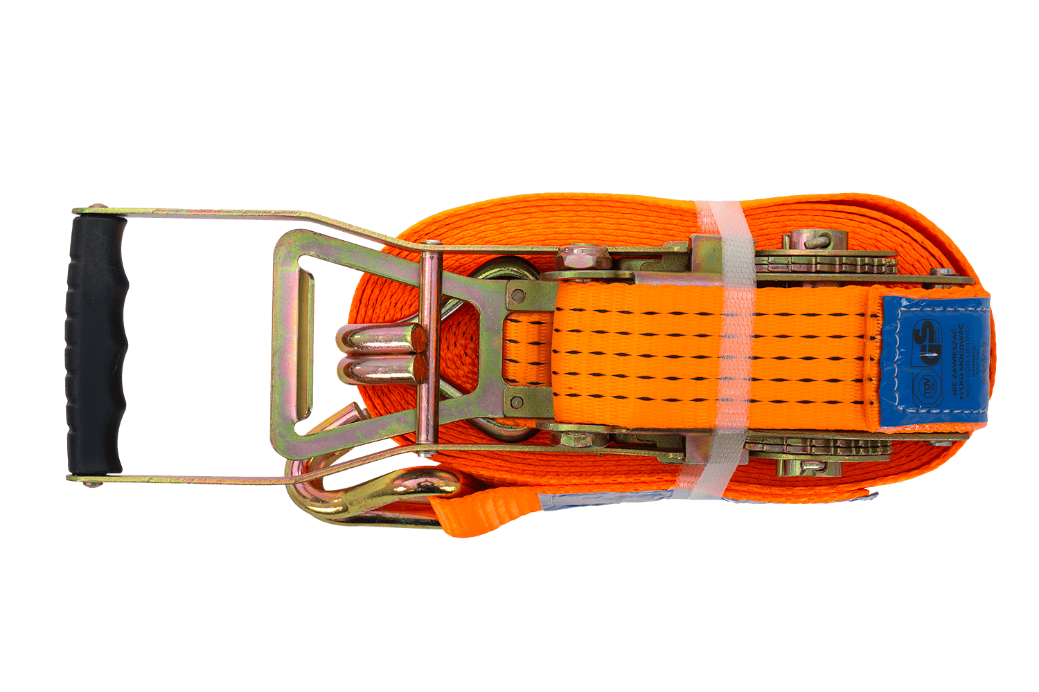 La correa de transporte ERGO naranja con tensor consta de dos partes: una más corta con un tensor avanzado (es decir, un sonajero) y un gancho, y otra más larga con una correa que también termina en un gancho. Se caracteriza por una mayor durabilidad y un mayor nivel de seguridad gracias al diseño especial del tensor, que proporciona un parámetro STF más alto, lo que permite presionar la carga más firmemente contra el suelo. La longitud total del cinturón, incluidas las correas y la hebilla, es de 10 metros, lo que proporciona longitud suficiente para asegurar cargas más grandes. El ancho de la cinta de 50 mm proporciona una superficie de prensado adecuada. La correa tiene una resistencia sólida: hasta 5 toneladas (5000 daN), y la estructura reforzada de todo el mecanismo tensor garantiza confiabilidad al asegurar cargas más pesadas, al tiempo que facilita significativamente la operación.