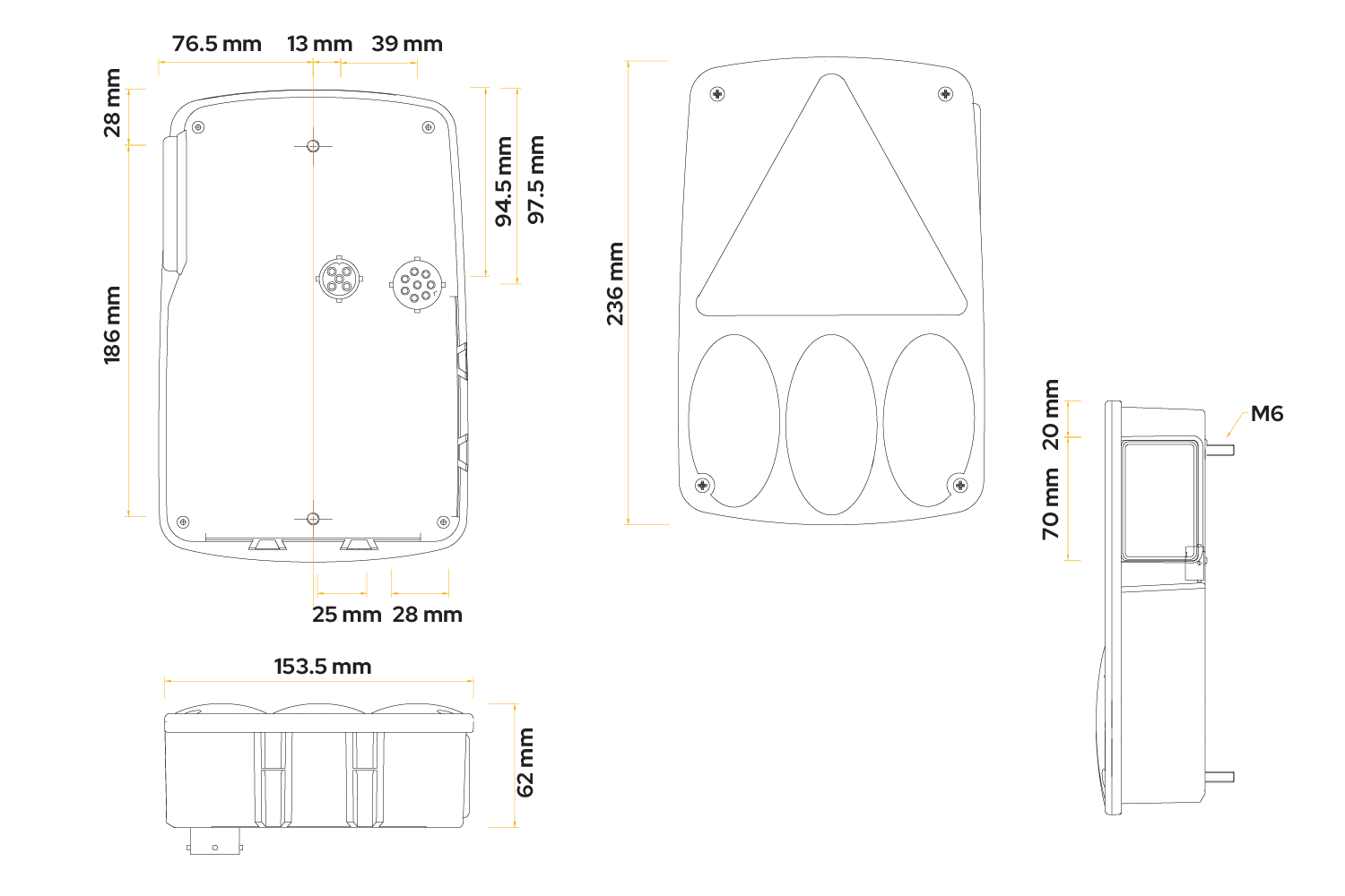 La luz trasera Earpoint IV de ASPÖCK está diseñada para instalarse en el lado izquierdo del vehículo y tiene las siguientes dimensiones: ancho 153,5 mm, alto 236 mm, fondo 62 mm . Equipado con conectores de bayoneta de 5 y 8 pines , permite una instalación fácil y rápida en remolques, autobuses y grúas .
