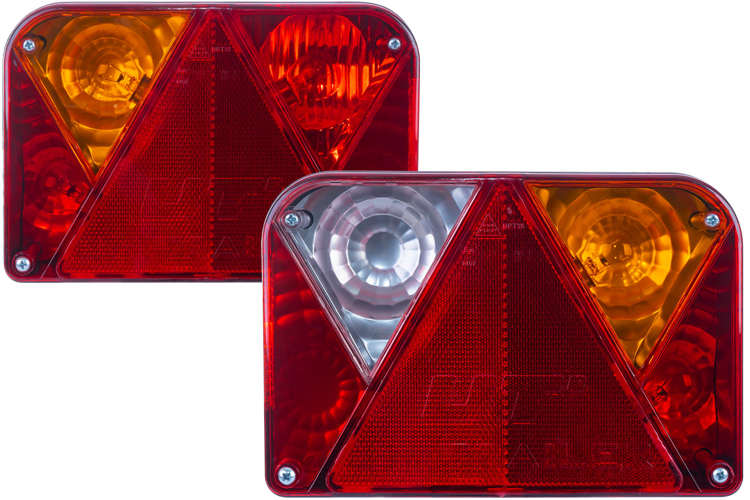 Un juego de dos luces traseras DPT35 de la marca DOBPLAST , destinadas al montaje en el lado izquierdo y derecho del vehículo , se caracterizan por las siguientes dimensiones: ancho 200 mm, alto 135 mm, profundidad 54 mm . Ambas lámparas están equipadas con un conector de bayoneta de 5 pines , lo que permite una fácil y rápida instalación en remolques, autobuses o trailers. Los pilotos traseros disponen de homologación E20 , que cumple los requisitos de las normas europeas de seguridad y calidad .