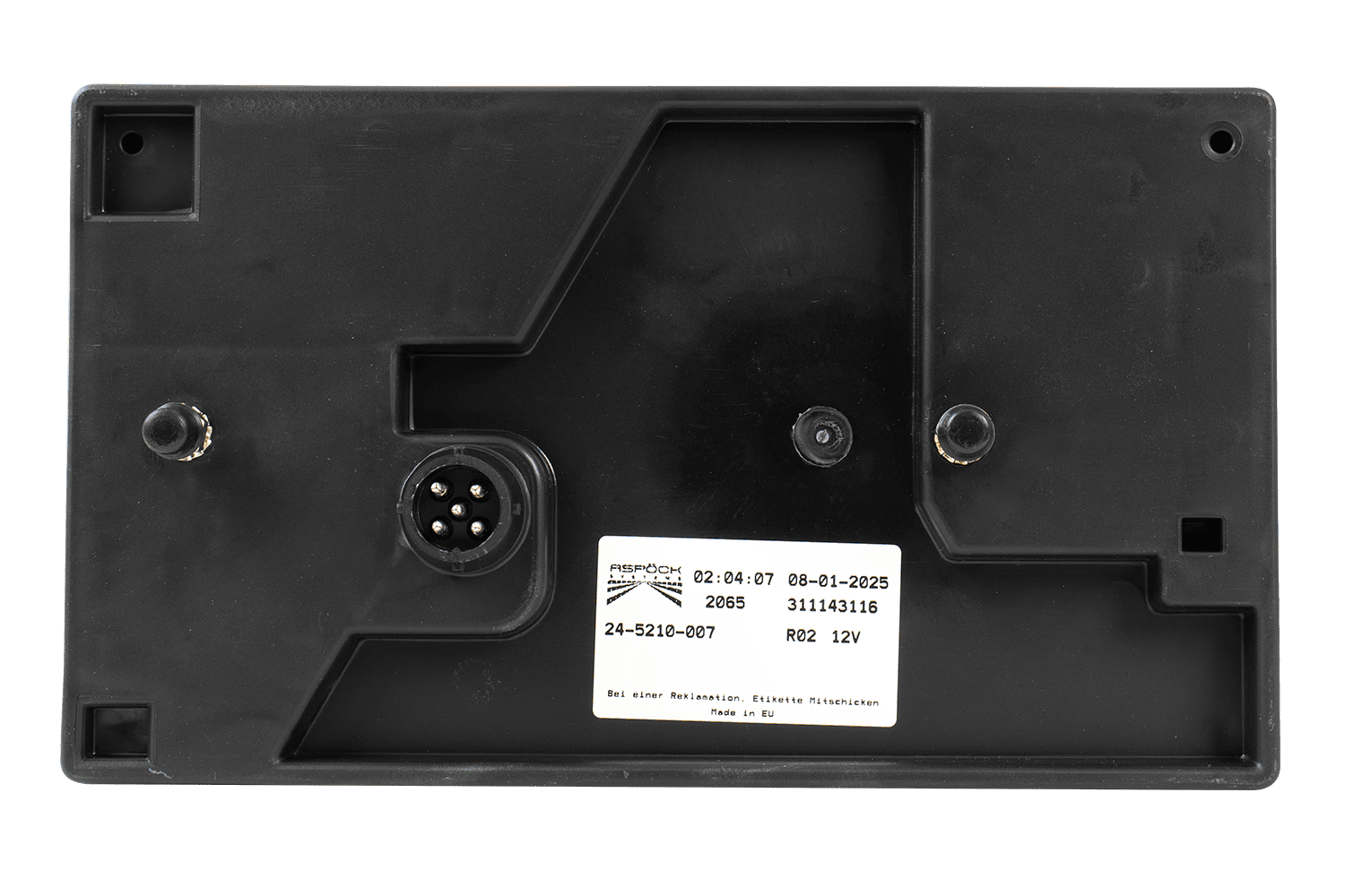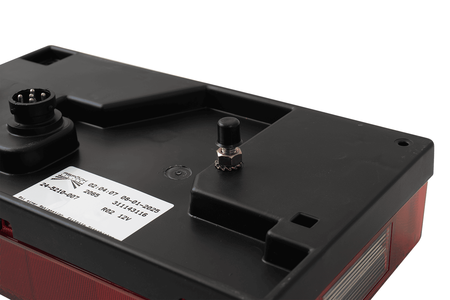 La luz trasera Multipoint I de ASPÖCK está diseñada para instalarse en el lado derecho del vehículo y tiene las siguientes dimensiones: ancho 240 mm, alto 140 mm, fondo 52 mm . Equipado con un conector de bayoneta de 5 pines , permite una instalación fácil y rápida en remolques, autobuses y grúas .