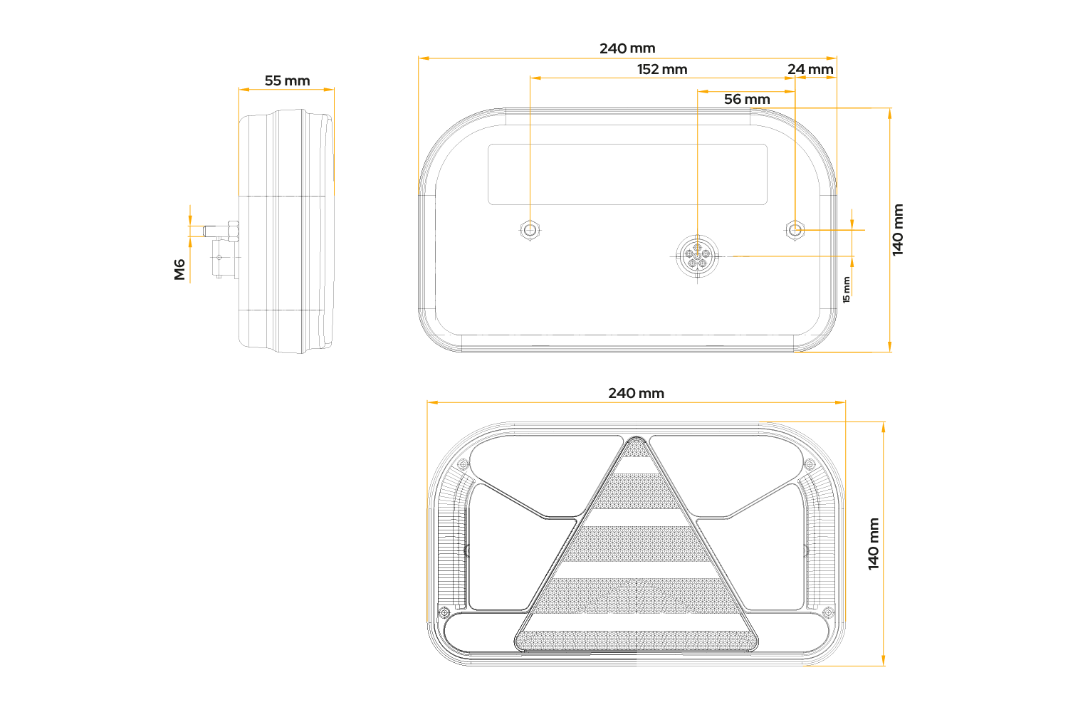 La luz trasera LED FT-170 de FRISTOM, diseñada para su instalación en el lado izquierdo del vehículo , tiene las siguientes dimensiones: ancho 240 mm, alto 140 mm, profundidad 55 mm . Diseñado para operar dentro de un rango de voltaje de 12–36 V , se puede utilizar en remolques, camiones y grúas, lo que resalta su universalidad . Equipado con un conector de bayoneta de 5 pines , permite una instalación fácil y rápida. Gracias al uso de tecnología LED, la lámpara proporciona un alto rendimiento, durabilidad y eficiencia energética, garantizando la seguridad en diversas condiciones de la carretera. La construcción de la lámpara es resistente a golpes y daños mecánicos, y también tiene protección eléctrica contra polaridad inversa, lo que aumenta adicionalmente su confiabilidad en condiciones de funcionamiento difíciles.