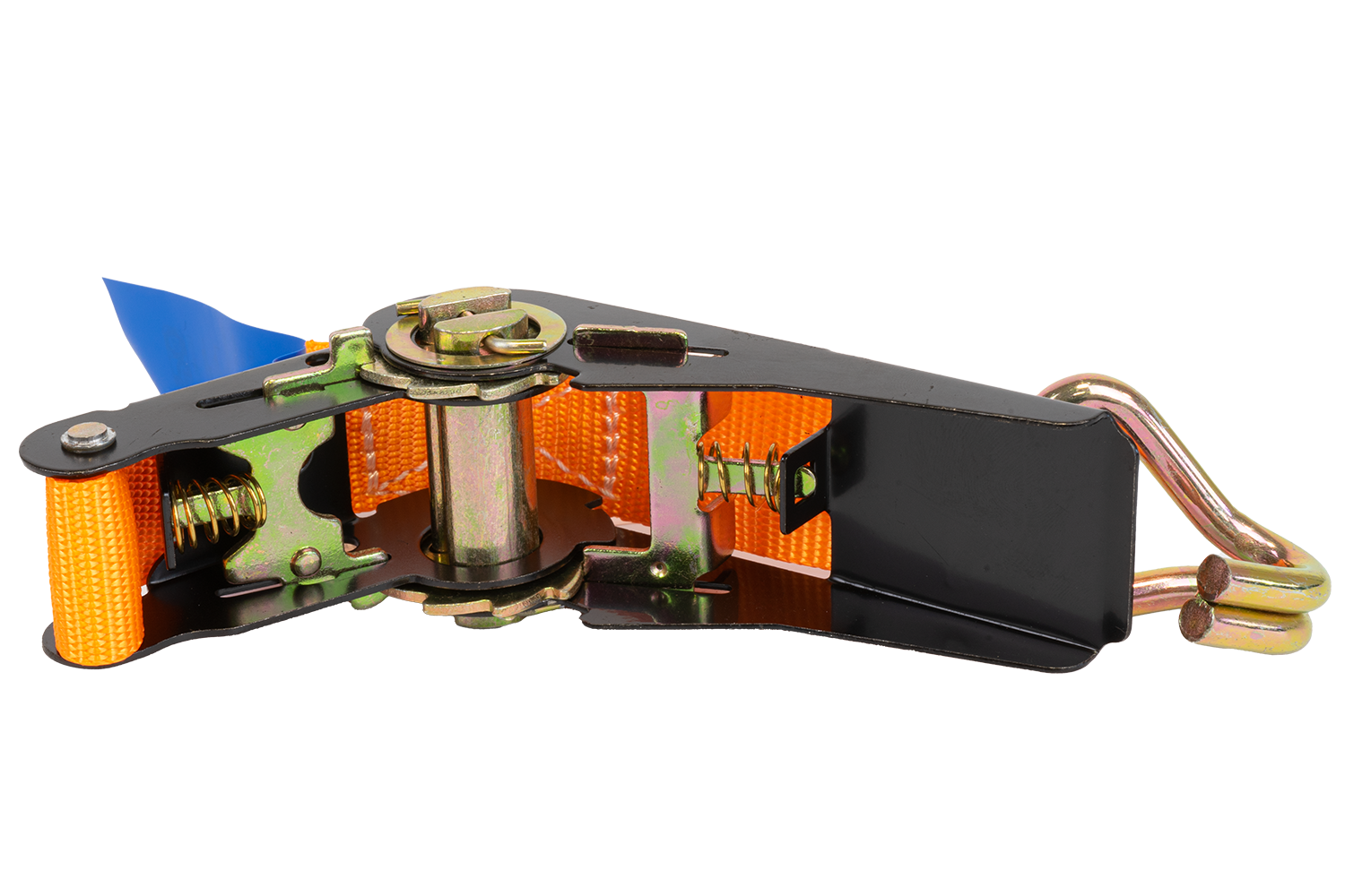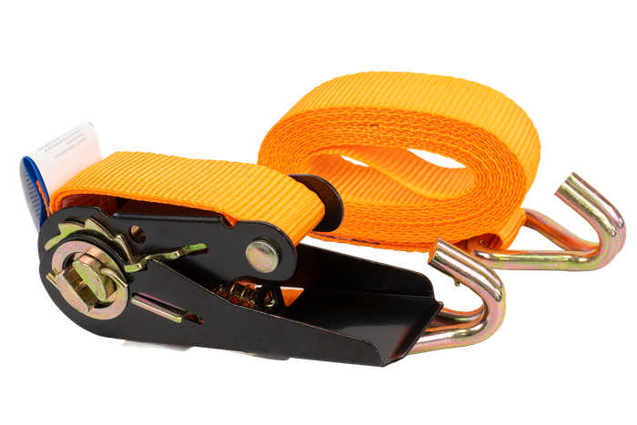 La correa de amarre con trinquete naranja KAMAR consta de dos partes: una más corta con trinquete y gancho, y una más larga con correa y gancho. La longitud total de la correa, incluyendo la correa y la hebilla, es de 3 metros, lo que proporciona suficiente longitud para diversas aplicaciones de transporte. La correa de 25 mm de ancho proporciona una superficie de sujeción óptima. La correa tiene una resistencia a la tracción de 0,8 toneladas (800 daN), lo que la hace ideal para asegurar con seguridad cargas pequeñas como equipos de jardinería, materiales de construcción ligeros o equipos de taller durante el transporte.