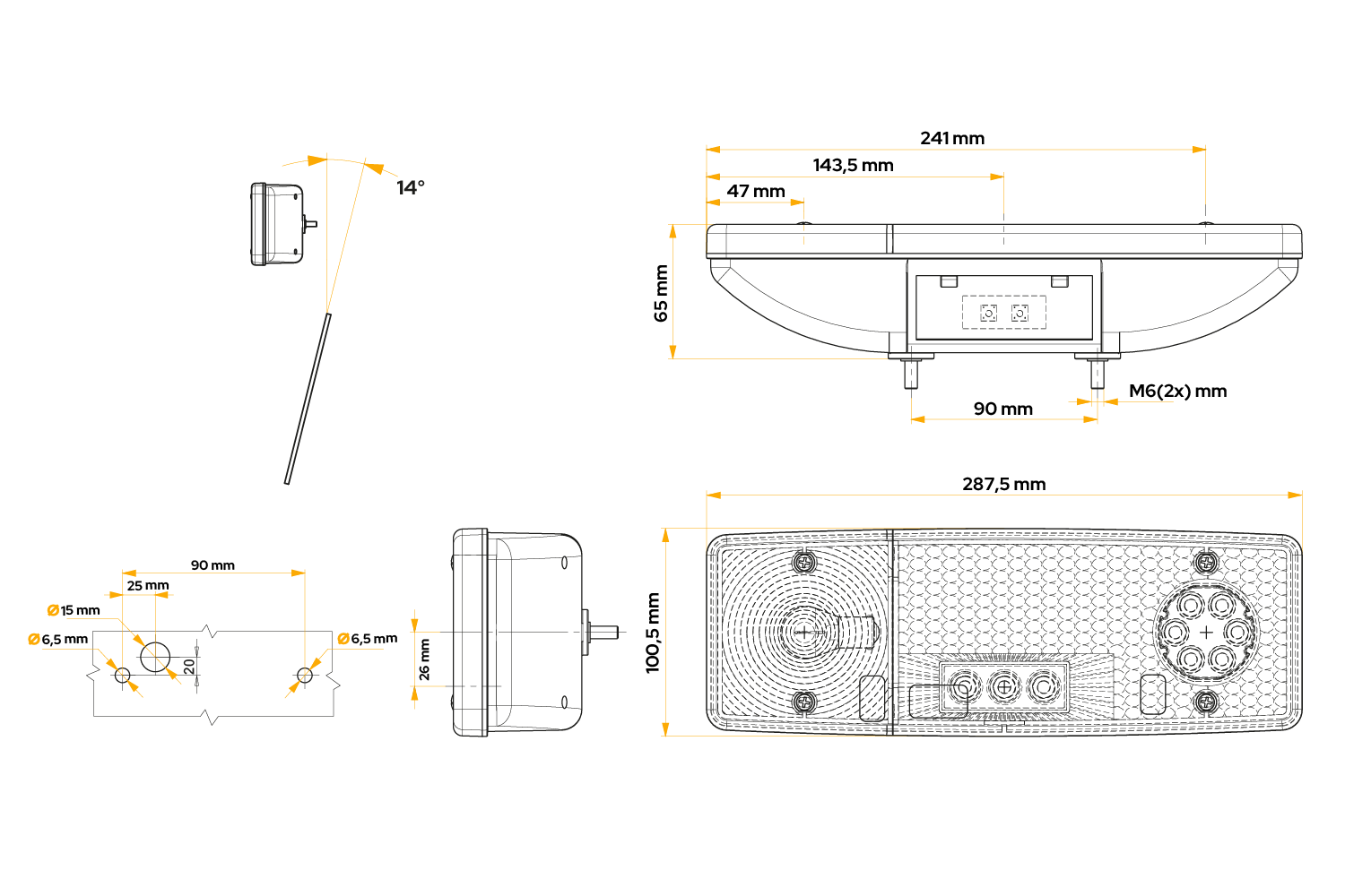 La luz trasera WE549L de WAŚ está diseñada para su montaje en el lado izquierdo del vehículo y tiene las siguientes dimensiones: ancho 287,5 mm, alto 100,5 mm, profundidad 65 mm . En la parte posterior de la lámpara hay un ojal que facilita la conexión del cable, lo que la convierte en una solución ideal para su uso en remolques, autobuses y grúas .