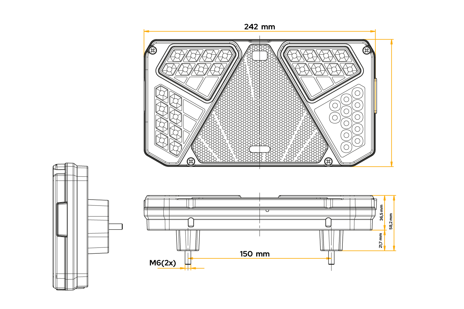 Luz trasera con homologación E20 y Cumplimiento de las normativas ECE R3, R4, R6, R7, R23 y R38 Cumple con los más altos requisitos de seguridad y funcionalidad en los vehículos. Homologación ECE R3 incluye elementos reflectantes , mejorando la visibilidad del vehículo, y ECE R4 regula las marcas reflectantes , aumentando la seguridad vial. La norma ECE R6 se aplica a los indicadores de dirección , garantizando su adecuada visibilidad y frecuencia de parpadeo, mientras que ECE R7 cubre las luces de posición y de freno , garantizando el cumplimiento de las normas de seguridad. La norma ECE R23 confirma la eficacia de las luces de marcha atrás , aumentando la seguridad en las maniobras y ECE R38 regula los estándares de luces antiniebla , mejorando la visibilidad en condiciones climáticas difíciles. La homologación E20 , concedida por Estonia, confirma el cumplimiento de las normas europeas, convirtiendo la lámpara en una solución ideal para remolques, semirremolques, grúas y vehículos especiales .