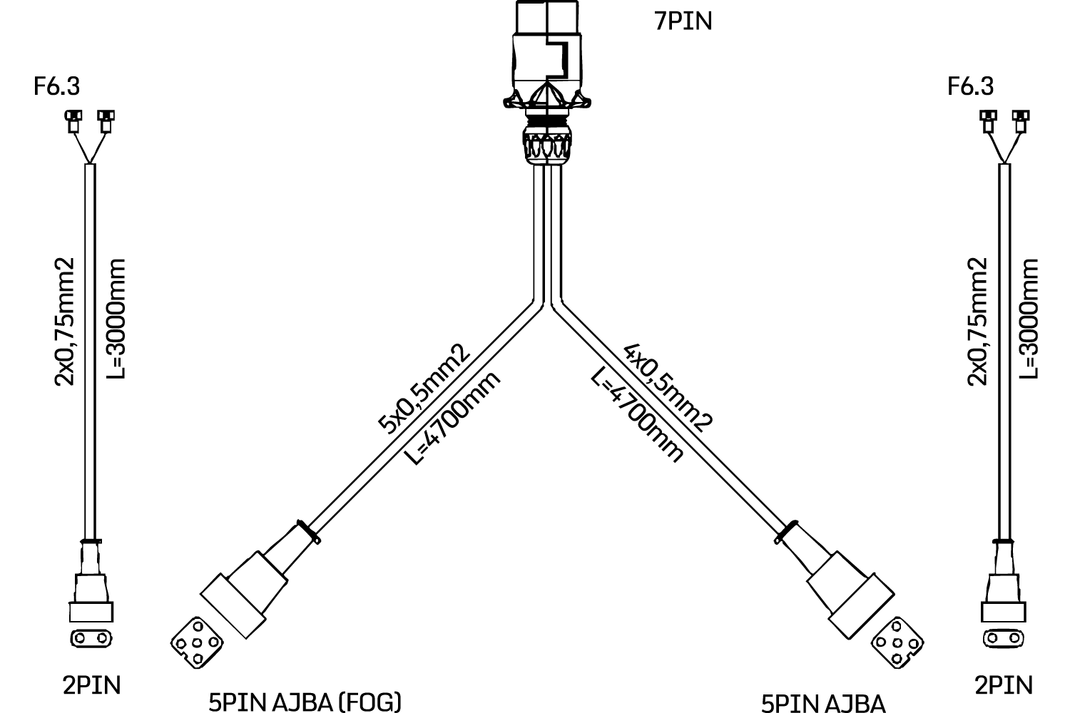 El arnés está equipado con dos conectores de bayoneta AJ.BA de 5 PIN y dos conectores de bayoneta AJ.BA de 2 PIN para conectar las luces traseras. El sistema de bayoneta garantiza una instalación rápida y segura, eliminando el riesgo de desconexión accidental durante la conducción. El diseño de los conectores garantiza una conexión impermeable y protege los contactos contra la corrosión, lo que se traduce en un funcionamiento a largo plazo y sin fallos de toda la instalación de iluminación del remolque.