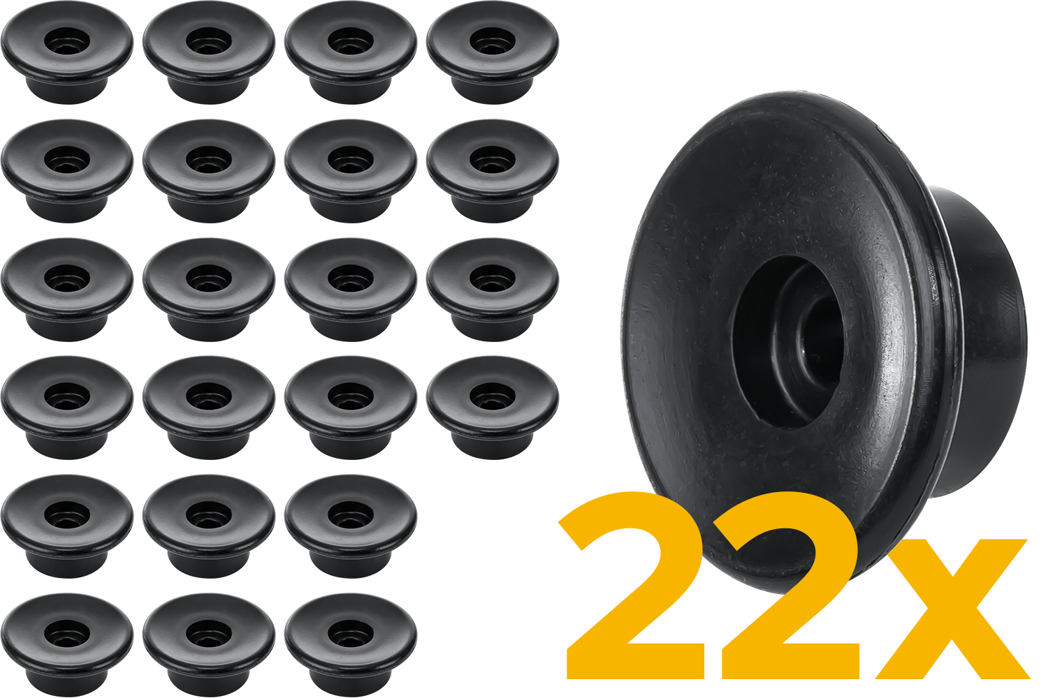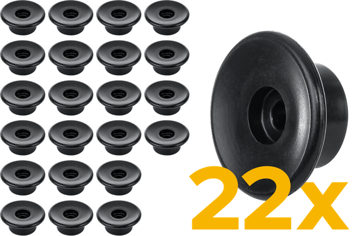 • Juego de 22 rodillos laterales de 30 mm de diámetro para remolques de automóviles y furgonetas de reparto. Diseñados para fijar cubiertas, redes y lonas al lateral mediante cuerda elástica.