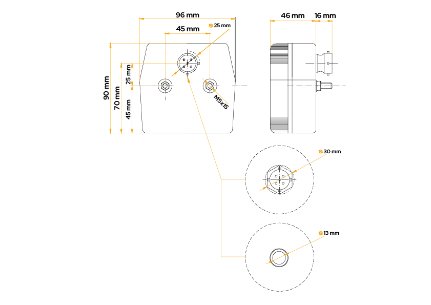 La luz trasera MD-002 de FRISTOM está diseñada para su montaje en el lado izquierdo y derecho del vehículo y se caracteriza por las siguientes dimensiones: ancho 96 mm, alto 90 mm, profundidad 46 mm . Hay una arandela de goma en la parte posterior de la lámpara que facilita la conexión del cable, lo que la hace ideal para usar en remolques y furgonetas .