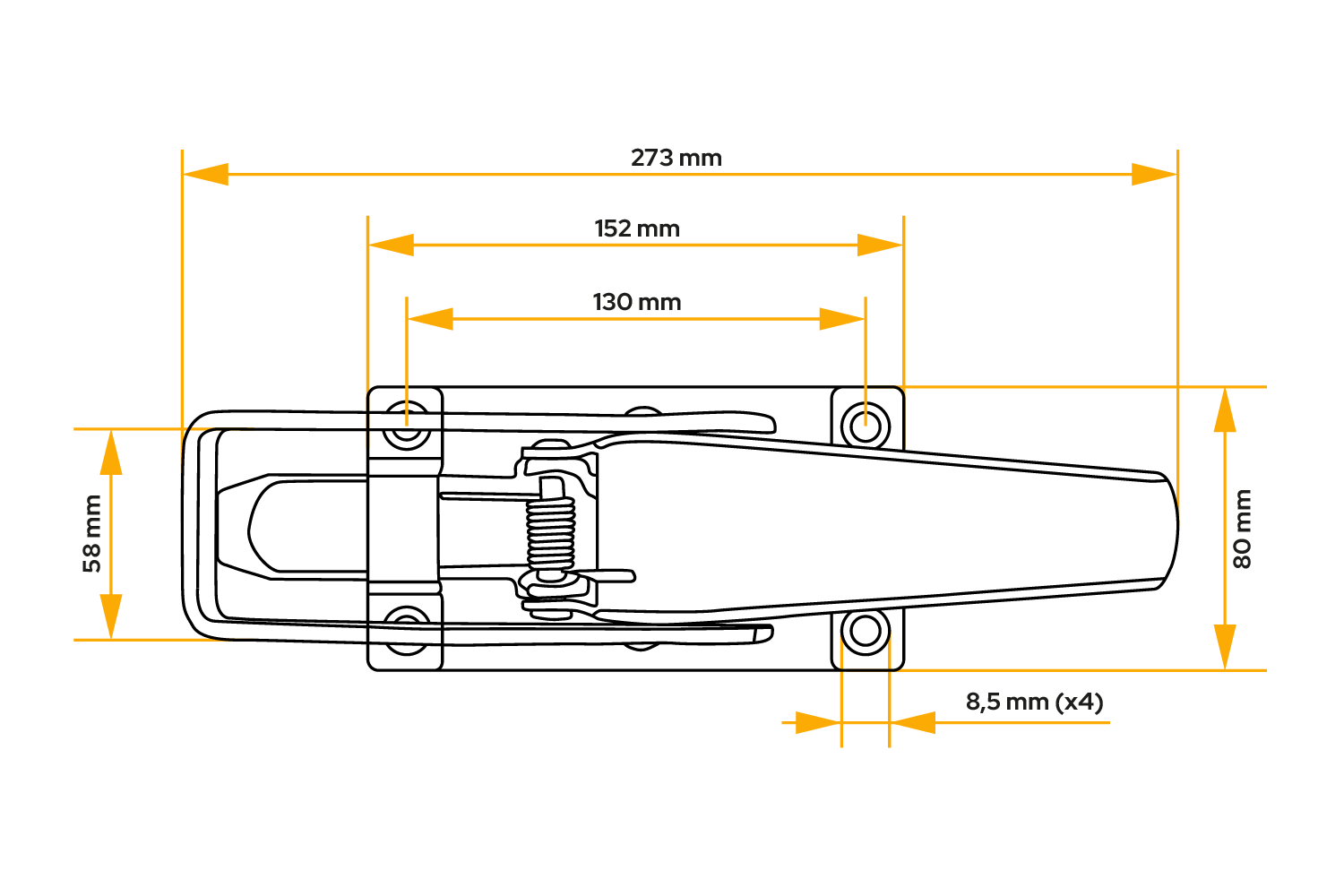 El enganche lateral KNOTT 417177.001 es un robusto componente de hardware para remolques, diseñado para asegurar de forma segura y permanente los laterales de remolques de carga, agrícolas y utilitarios. El enganche tiene 275 mm de largo y 80 mm de ancho de base , lo que garantiza su durabilidad incluso con uso intensivo .