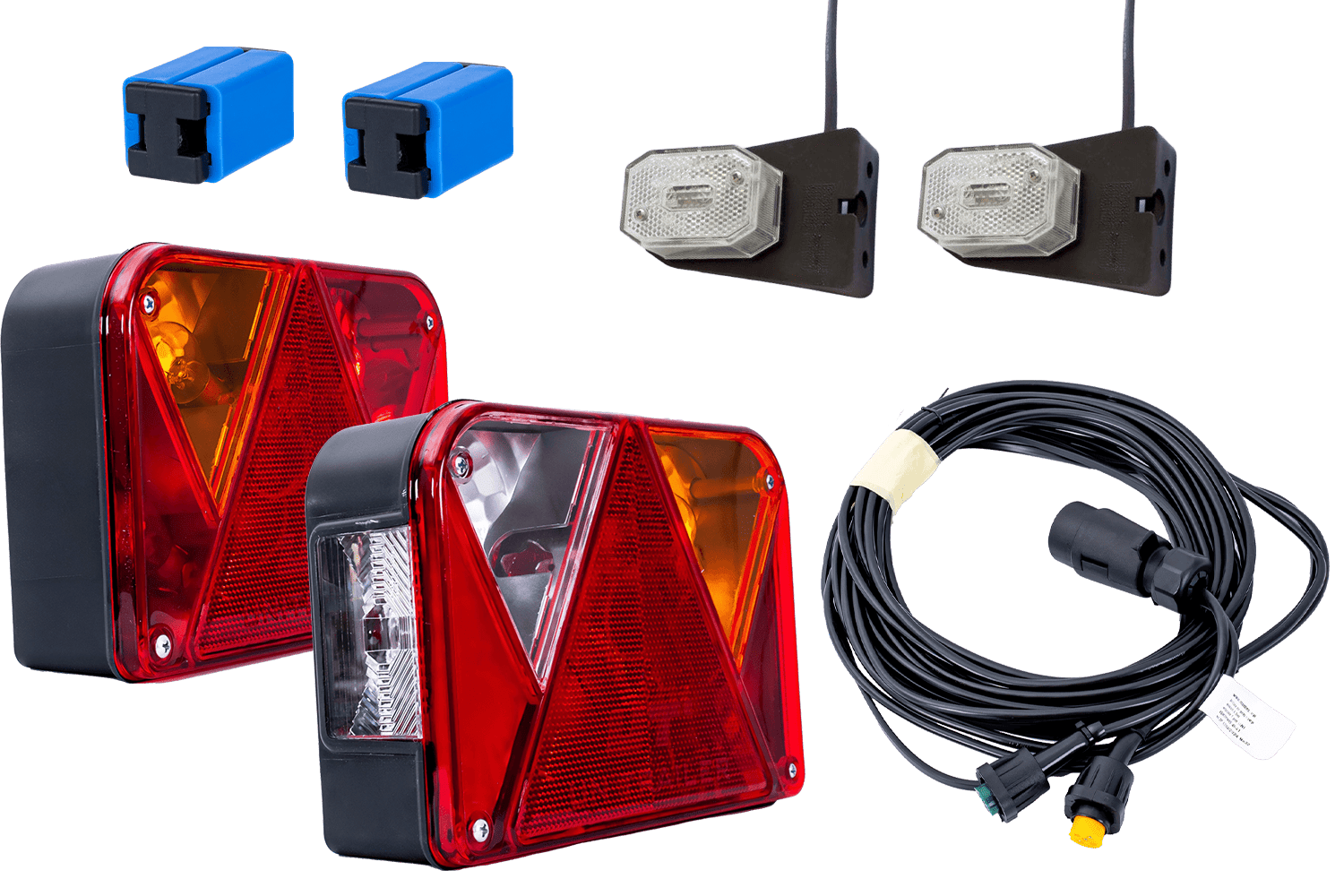 El kit de iluminación es una instalación eléctrica integral que proporciona una iluminación completa y conforme a la normativa para remolques, remolques y otros vehículos de transporte , aumentando así su visibilidad y seguridad vial. Consta de luces traseras, luces de posición, un mazo de cables y conectores rápidos. Estos conectores permiten una instalación rápida y sencilla, garantizando una conexión duradera y segura entre las luces de posición y el cableado. Gracias a sus componentes de alta calidad, el kit garantiza un funcionamiento fiable y una buena visibilidad. Y cumple con las normas de seguridad aplicables. Esta es la solución ideal para quienes buscan un sistema de iluminación vehicular completo y duradero .