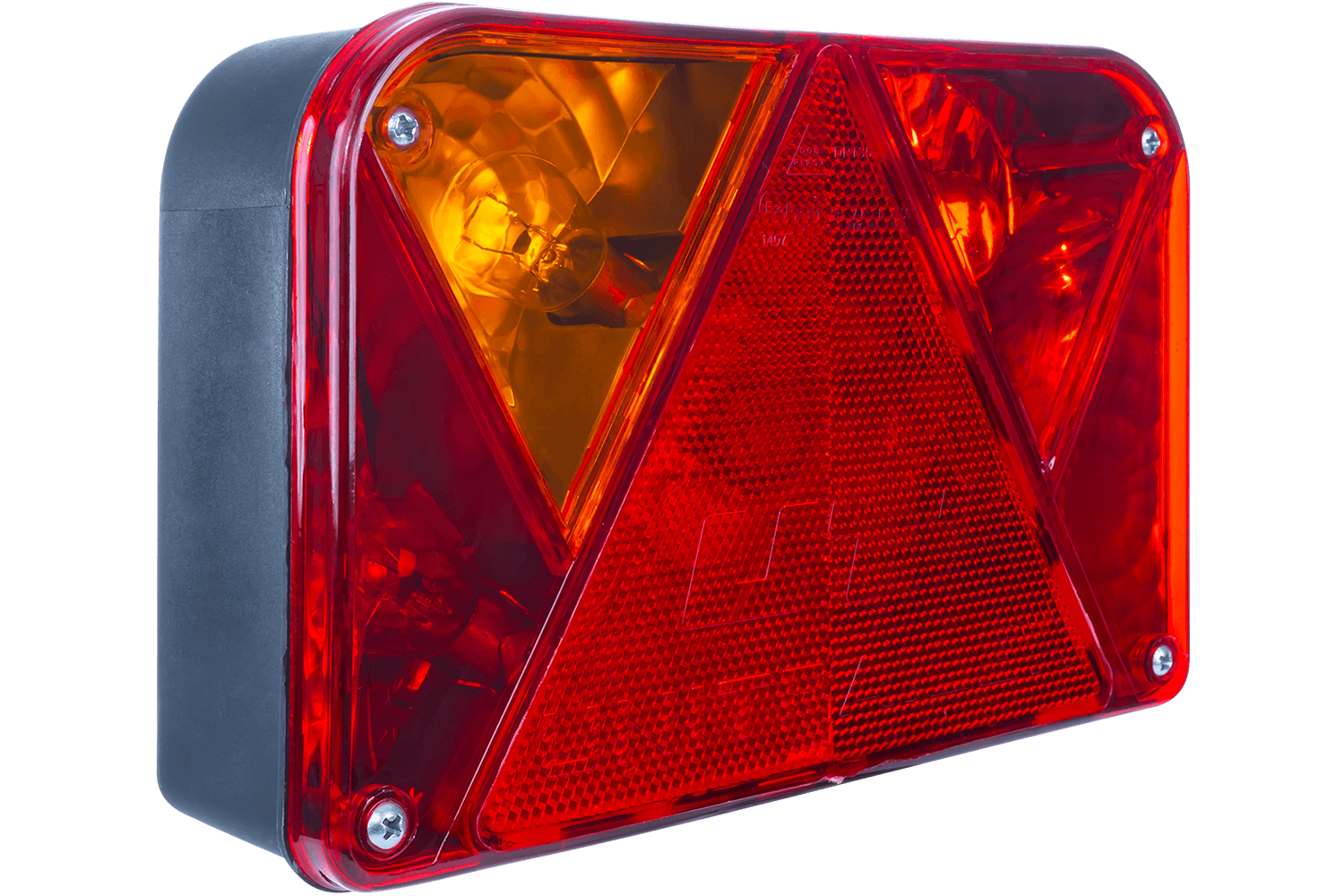 Funciones de la luz trasera: luz de posición , que garantiza la visibilidad del vehículo cuando se conduce de noche; luz de freno , señalización de frenado; señal de giro , que le permite indicar su intención de girar ; luz antiniebla , que aumenta la seguridad en condiciones climáticas difíciles, como niebla o fuertes lluvias ; iluminación de la matrícula , que garantiza la visibilidad del número de matrícula del vehículo durante la noche ; y un triángulo reflectante que aumenta la visibilidad del vehículo .