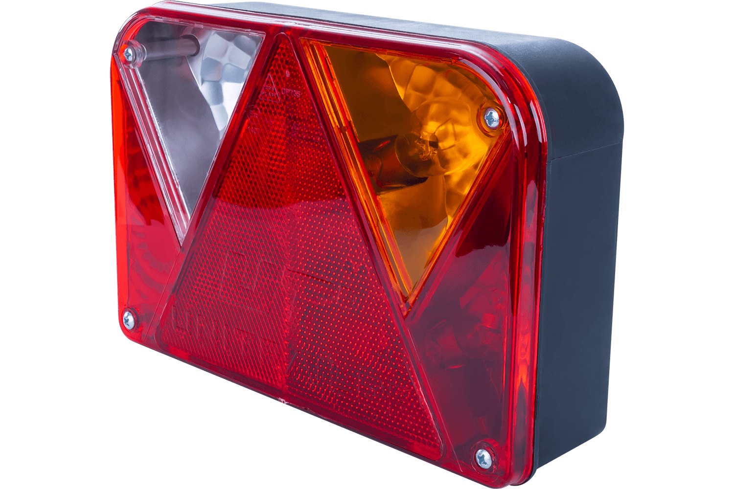 Funciones de la luz trasera: luz de posición , que garantiza la visibilidad del vehículo cuando se conduce de noche; luz de freno , señalización de frenado; señal de giro , que le permite indicar su intención de girar ; luz antiniebla , que aumenta la seguridad en condiciones climáticas difíciles, como niebla o fuertes lluvias ; iluminación de la matrícula , que garantiza la visibilidad del número de matrícula del vehículo durante la noche ; y un triángulo reflectante que aumenta la visibilidad del vehículo .