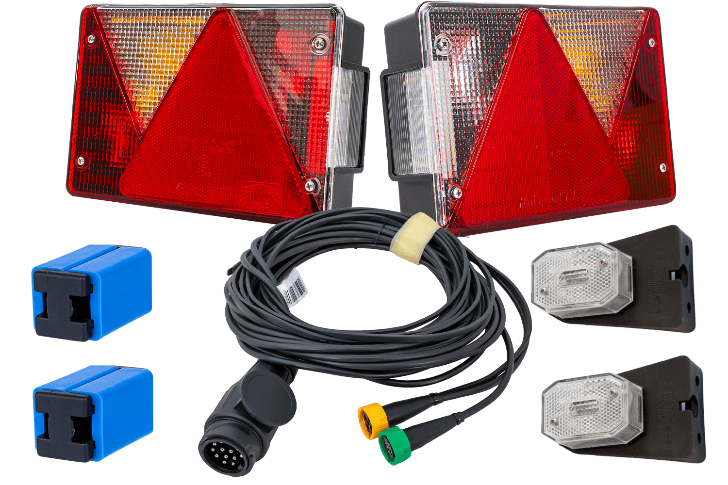 El kit de iluminación es una instalación eléctrica integral que proporciona una iluminación completa y conforme a la normativa para remolques, remolques y otros vehículos de transporte , aumentando así su visibilidad y seguridad vial. Consta de luces traseras, luces de posición, un mazo de cables y conectores rápidos. Estos conectores permiten una instalación rápida y sencilla, garantizando una conexión duradera y segura entre las luces de posición y el cableado. Gracias a sus componentes de alta calidad, el kit garantiza un funcionamiento fiable y una buena visibilidad. Y cumple con las normas de seguridad aplicables. Esta es la solución ideal para quienes buscan un sistema de iluminación vehicular completo y duradero .