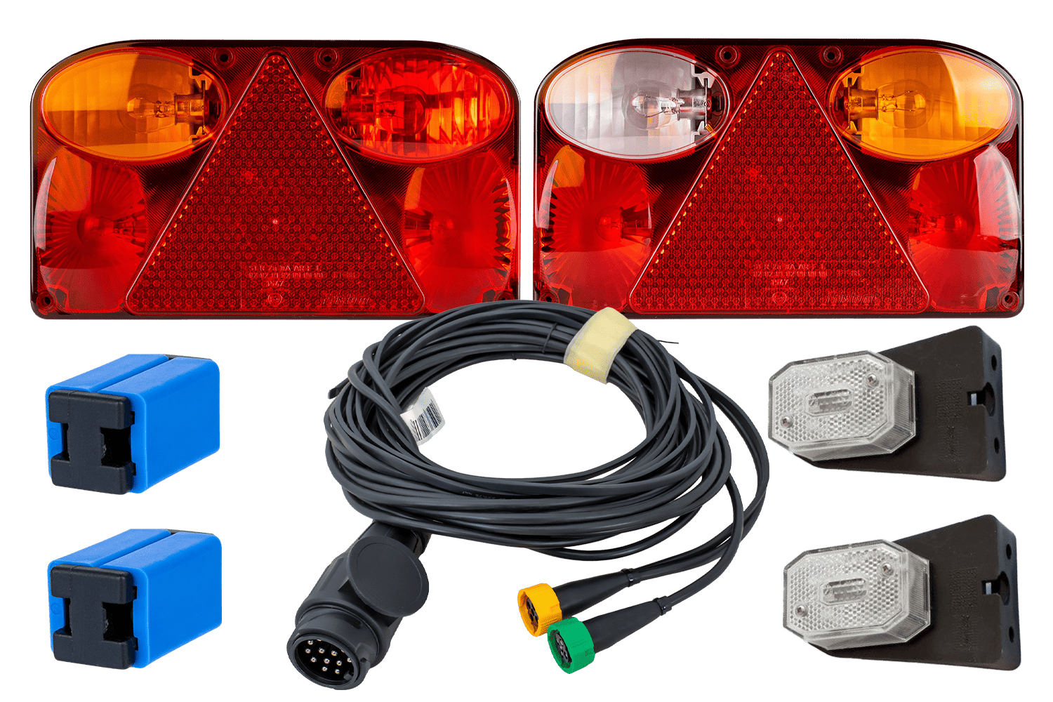 El kit de iluminación es una instalación eléctrica integral que proporciona una iluminación completa y conforme a la normativa para remolques, remolques y otros vehículos de transporte , aumentando así su visibilidad y seguridad vial. Consta de luces traseras, luces de posición, un mazo de cables y conectores rápidos. Estos conectores permiten una instalación rápida y sencilla, garantizando una conexión duradera y segura entre las luces de posición y el cableado. Gracias a sus componentes de alta calidad, el kit garantiza un funcionamiento fiable y una buena visibilidad. Y cumple con las normas de seguridad aplicables. Esta es la solución ideal para quienes buscan un sistema de iluminación vehicular completo y duradero .