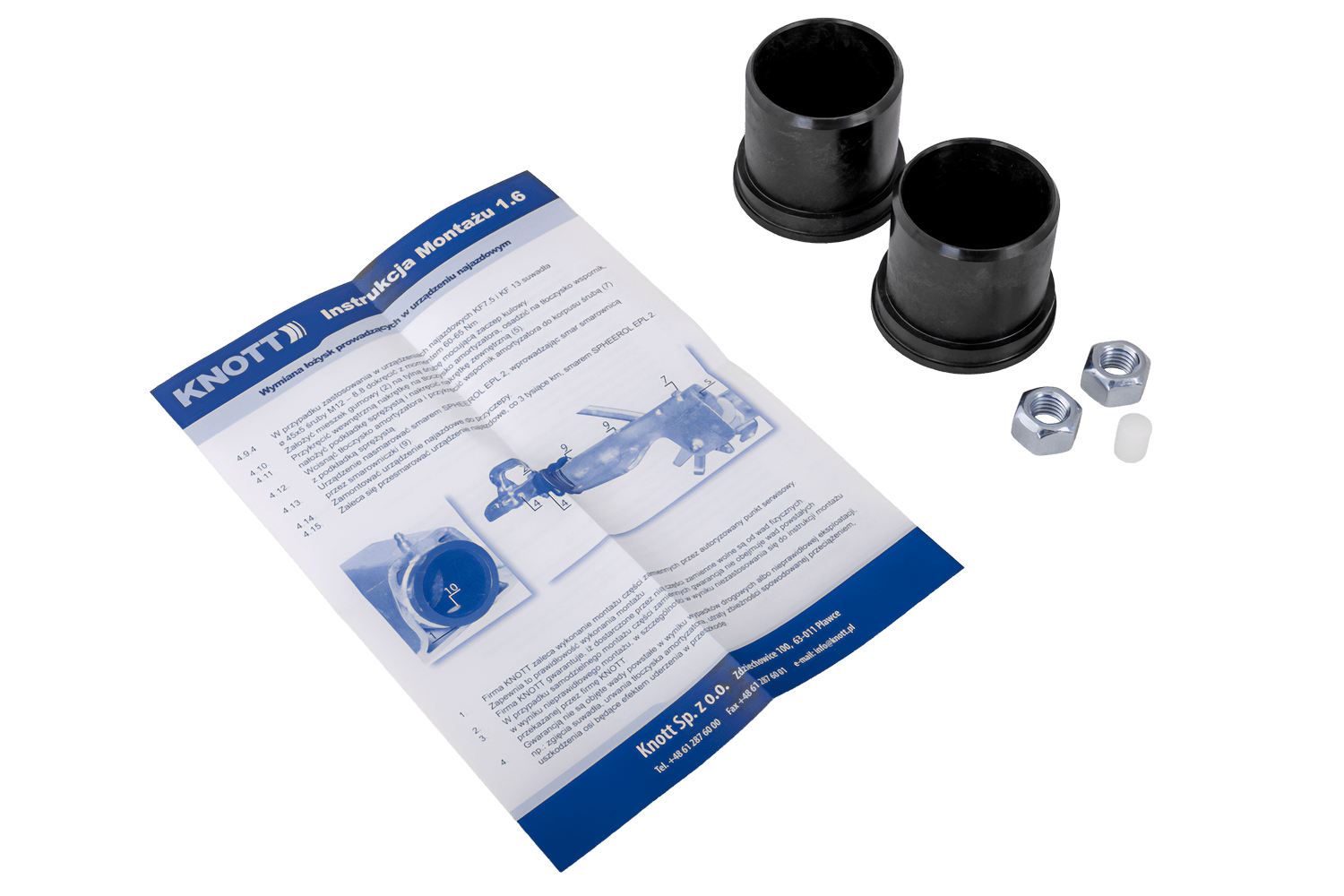 El kit de casquillo deslizante KNOTT KK0990S incluye todos los herrajes de montaje necesarios para la correcta sustitución de los cojinetes guía en los dispositivos de inercia. El kit incluye: 1 pasador guía PA66 de 10 x 14 mm (69004594) , que garantiza un ajuste estable del casquillo; 2 cojinetes guía de 44,6 mm (69000194), que garantizan un guiado preciso de la corredera; y 2 ​​tuercas autoblocantes M12 (D980.004) , que garantizan una conexión duradera y segura. Todos los componentes son compatibles con los dispositivos de inercia mencionados, lo que garantiza una alta durabilidad, precisión de montaje y un funcionamiento fiable del mecanismo.