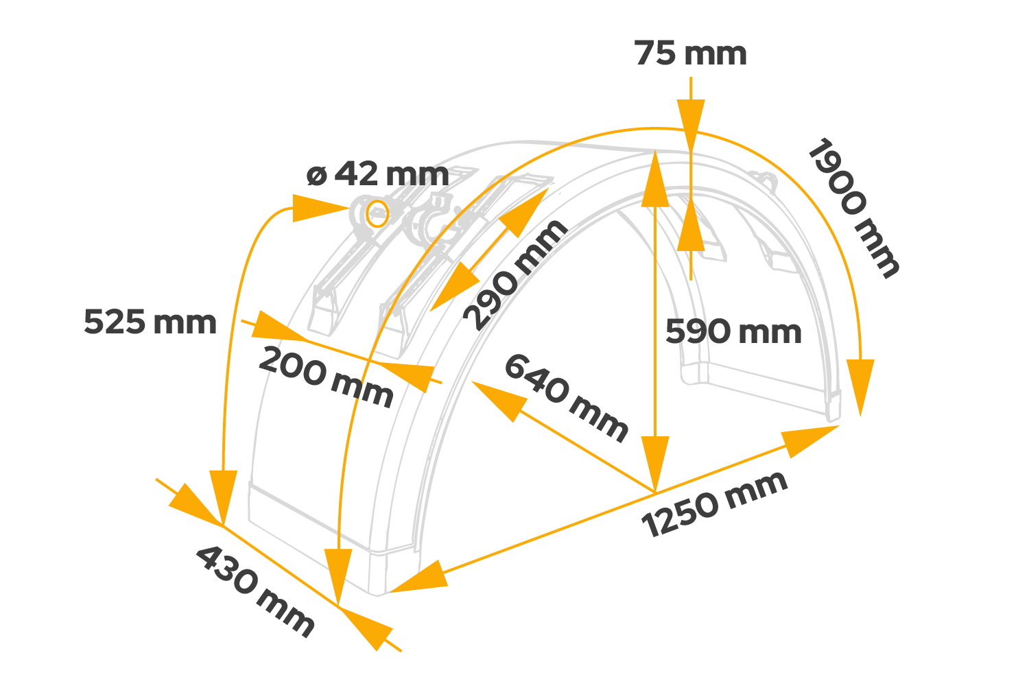El guardabarros simple DK2975 DOMAR, diseñado para ruedas con un diámetro de 19,5 a 22,5 pulgadas, es un elemento fiable de equipamiento para, entre otros, semirremolques y remolques de camión con ruedas simples, así como para algunas máquinas de construcción y agrícolas de dimensiones adecuadas. Sus dimensiones son 1250 mm de largo, 430 mm de ancho y 590 mm de alto . El guardabarros está equipado con soportes de montaje integrados y ajustables de 42 mm de diámetro, que permiten una adaptación flexible a diferentes modelos de vehículo. Los soportes cuentan con almohadillas de goma que proporcionan un mejor agarre y amortiguan las vibraciones.