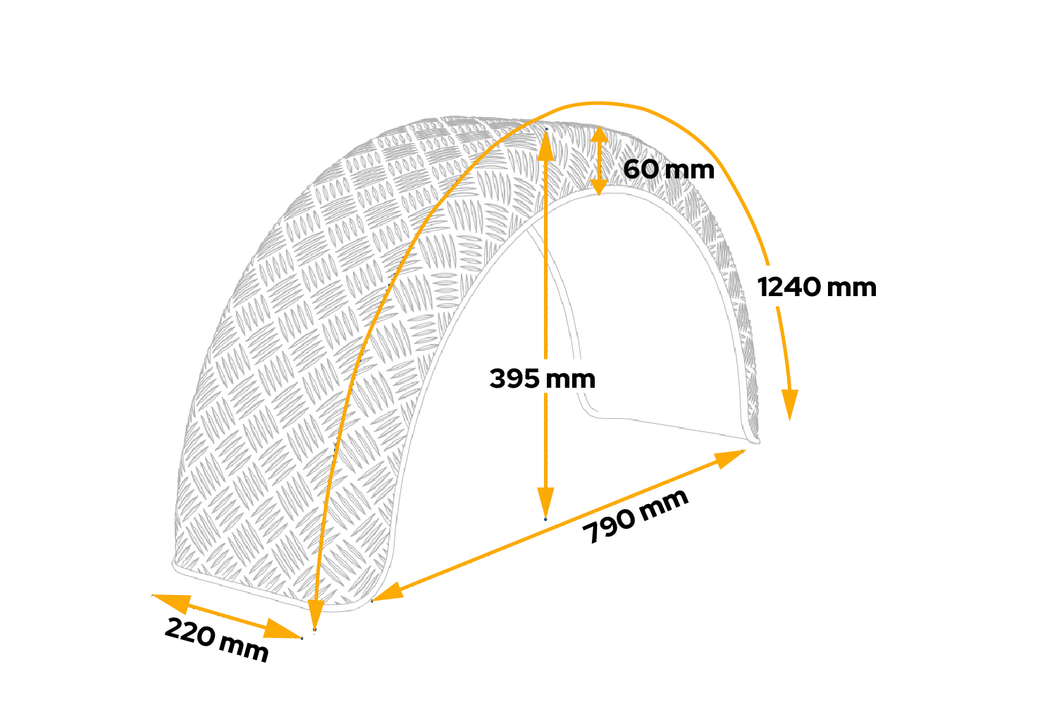 El guardabarros simple DOMAR D29130 diseñado para ruedas de 15 y 16 pulgadas es un elemento fiable de equipamiento para, entre otros, remolques de turismo. Sus dimensiones son 790 mm de largo, 220 mm de ancho y 395 mm de alto . Gracias a su sólida construcción de chapa de aluminio, el guardabarros es ligero, resistente a la corrosión y extremadamente duradero, lo que lo hace ideal para condiciones de uso intensivo. Una ventaja adicional es su borde especial que aumenta la rigidez de la estructura y mejora la protección contra salpicaduras. El guardabarros no tiene orificios de montaje de fábrica , lo que permite al usuario ajustar los puntos de montaje a su vehículo.
