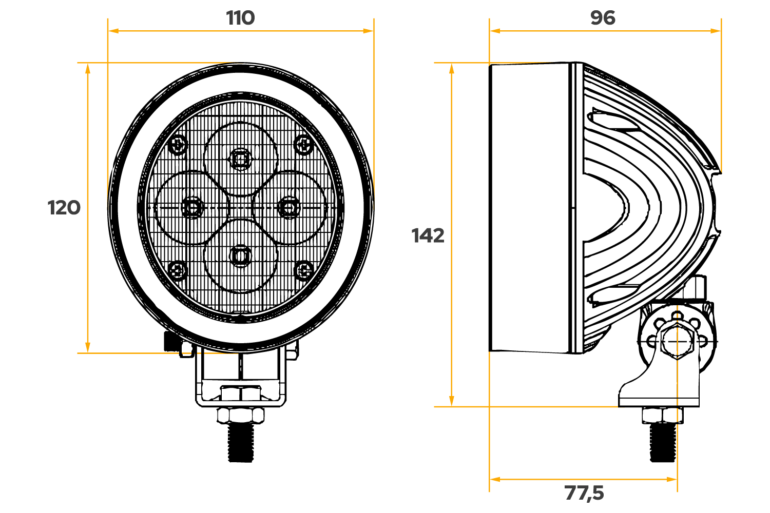 La lámpara se caracteriza por una alta resistencia a golpes, vibraciones y temperaturas extremas que oscilan entre -40°C y +80°C, lo que garantiza su funcionamiento fiable en condiciones de trabajo difíciles. El ángulo de haz ajustable permite un ajuste preciso del haz de luz, minimizando el riesgo de cegar a otros usuarios de la carretera y aumentando así la comodidad y la seguridad en el trabajo. Además, la lámpara cumple con los requisitos de la norma CISPR 25 Clase 4 , lo que significa una alta eficiencia en la reducción del ruido electromagnético , por lo que no interfiere con el funcionamiento de otros dispositivos electrónicos en el vehículo y se puede utilizar de forma segura en máquinas modernas equipadas con electrónica sensible.