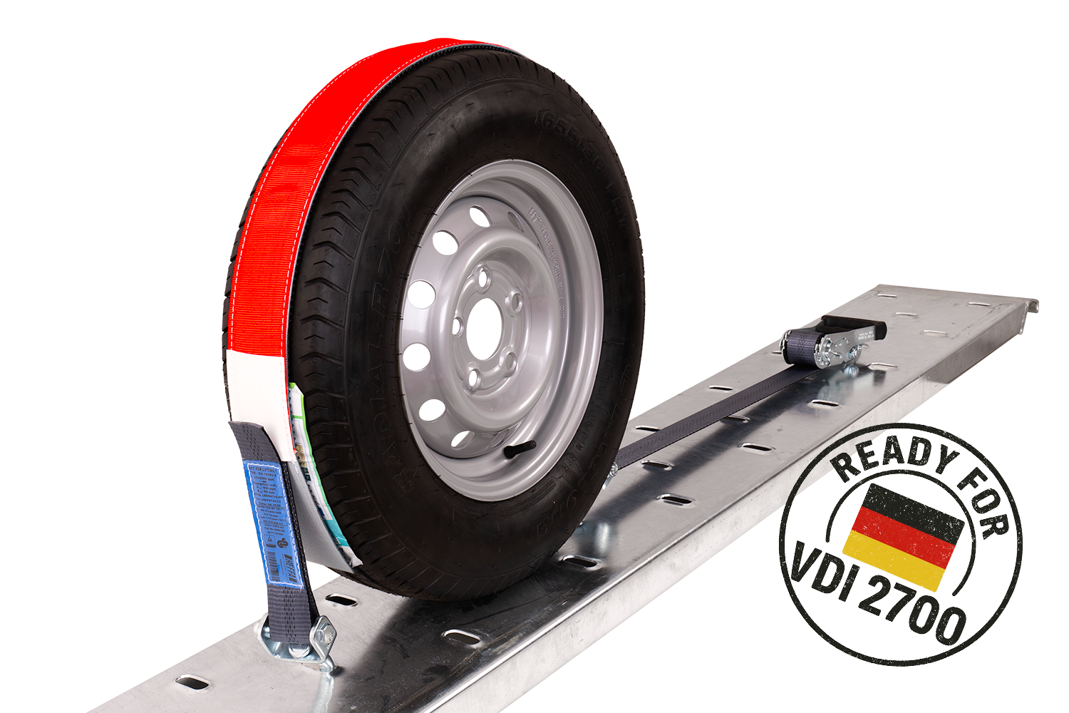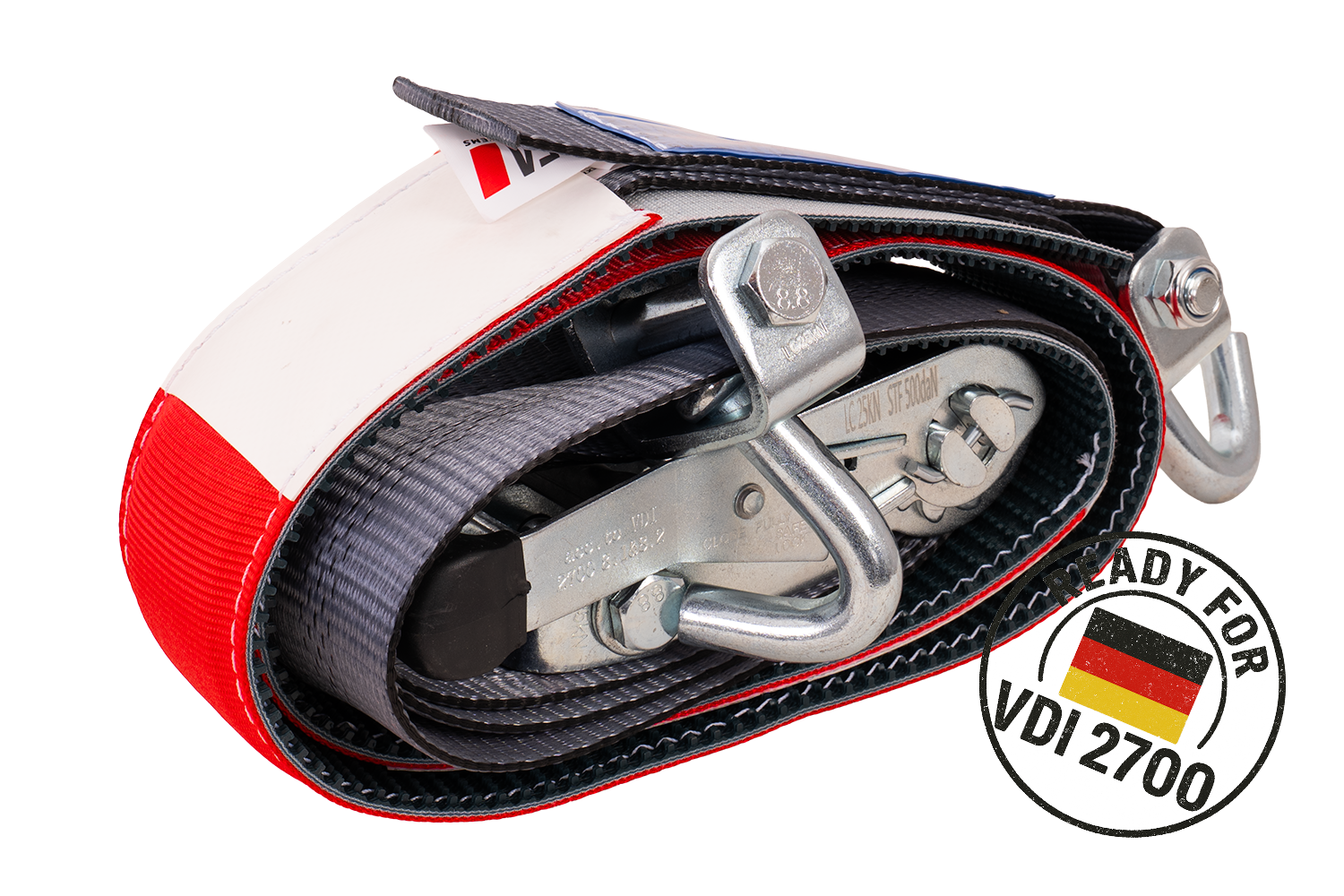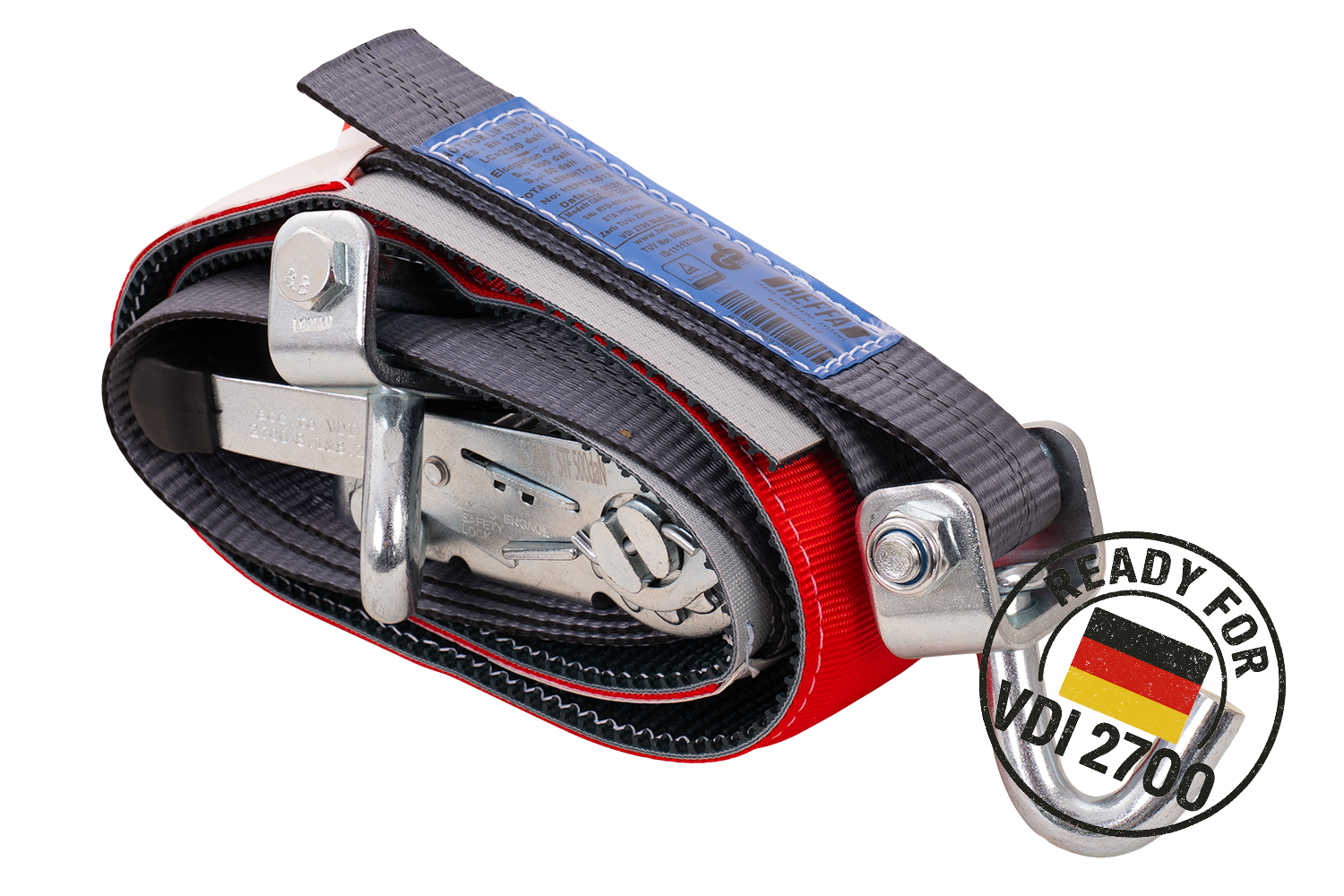 La Directiva VDI 2700 Parte 8.1 es una norma técnica alemana que especifica los requisitos detallados para la sujeción de vehículos transportados en remolques de plataforma y remolques . En relación con las correas de amarre, con flejado de ruedas, esta directiva especifica, entre otros aspectos, el método de disposición de las correas, el número requerido de puntos de amarre (p. ej., sistema de 3 puntos), los parámetros mínimos de fuerza de tensión y los principios de su marcado y homologaciones técnicas. El cumplimiento de la VDI 2700 Parte 8.1 significa que las correas cumplen rigurosos requisitos en términos de seguridad, fiabilidad y eficacia de la inmovilización del vehículo transportado , lo cual es crucial para el transporte profesional de turismos y furgonetas. Gracias a esto, el usuario puede estar seguro de que el sistema de amarre utilizado cumple con las normas europeas y alemanas vigentes en materia de seguridad vial.