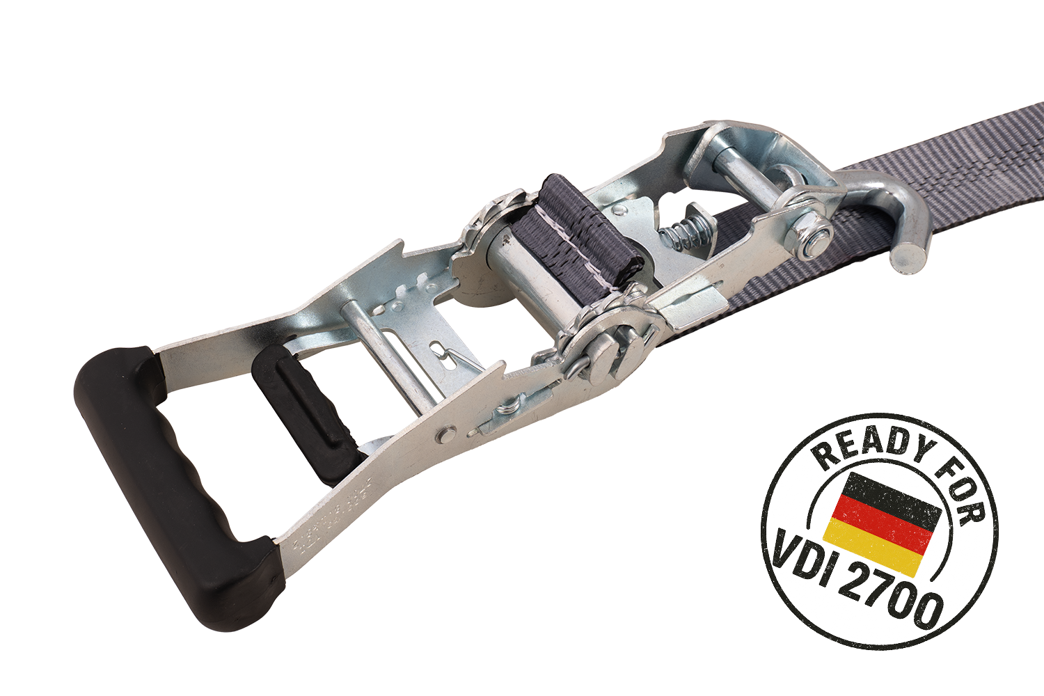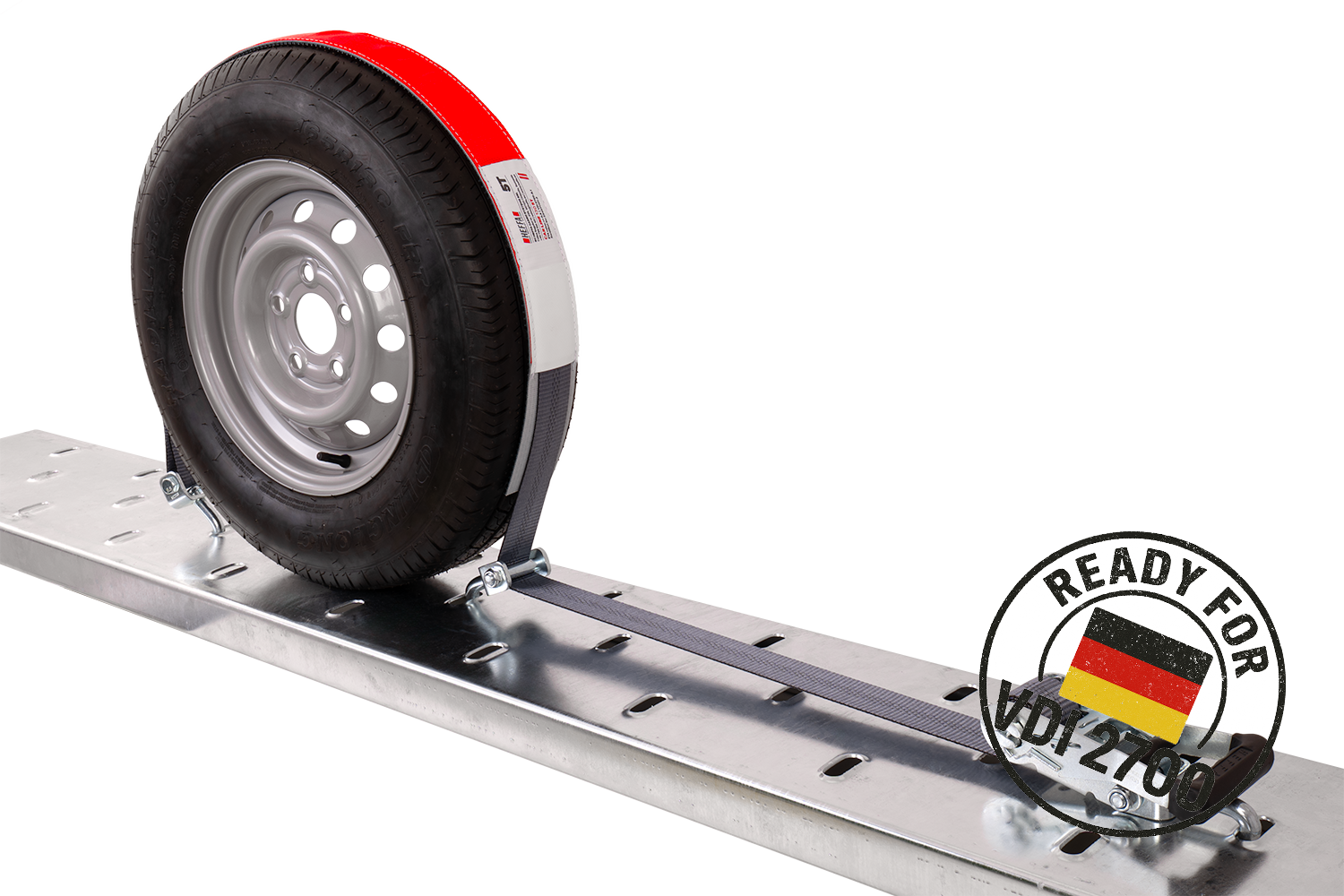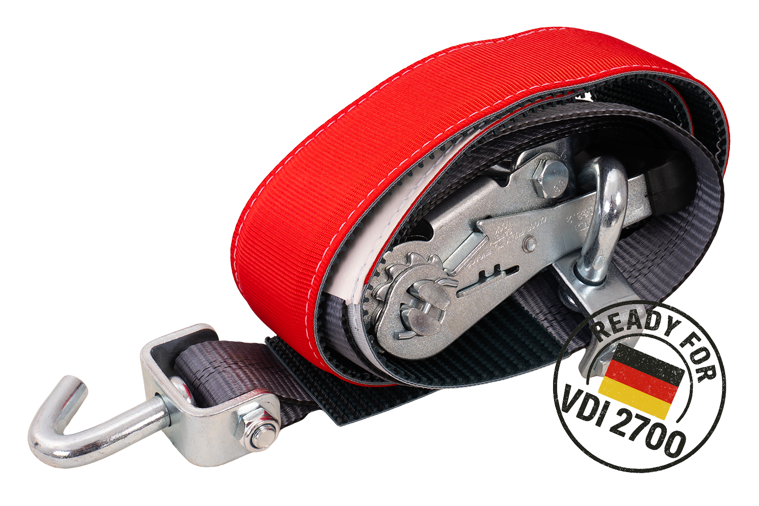 La Directiva VDI 2700 Parte 8.1 es una norma técnica alemana que especifica los requisitos detallados para la sujeción de vehículos transportados en remolques de plataforma y remolques . En relación con las correas de amarre, con flejado de ruedas, esta directiva especifica, entre otros aspectos, el método de disposición de las correas, el número requerido de puntos de amarre (p. ej., sistema de 3 puntos), los parámetros mínimos de fuerza de tensión y los principios de su marcado y homologaciones técnicas. El cumplimiento de la VDI 2700 Parte 8.1 significa que las correas cumplen rigurosos requisitos en términos de seguridad, fiabilidad y eficacia de la inmovilización del vehículo transportado , lo cual es crucial para el transporte profesional de turismos y furgonetas. Gracias a esto, el usuario puede estar seguro de que el sistema de amarre utilizado cumple con las normas europeas y alemanas vigentes en materia de seguridad vial.