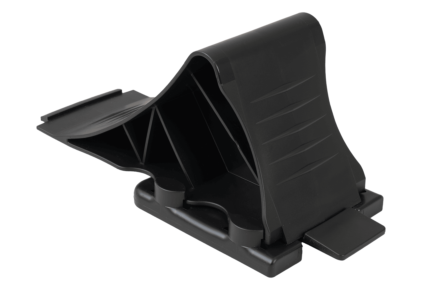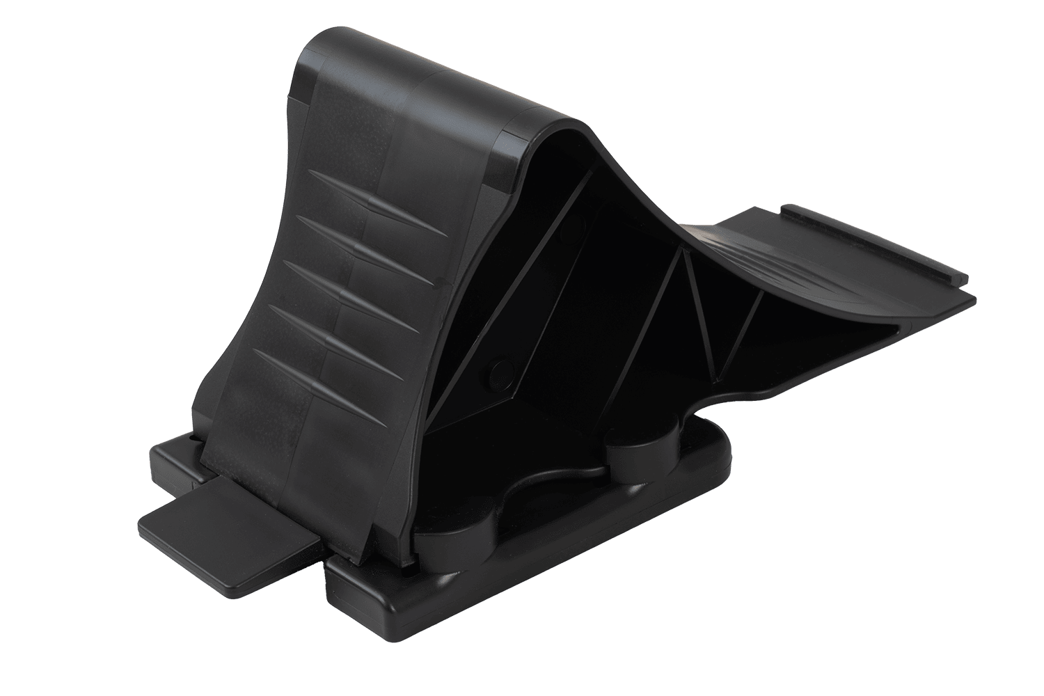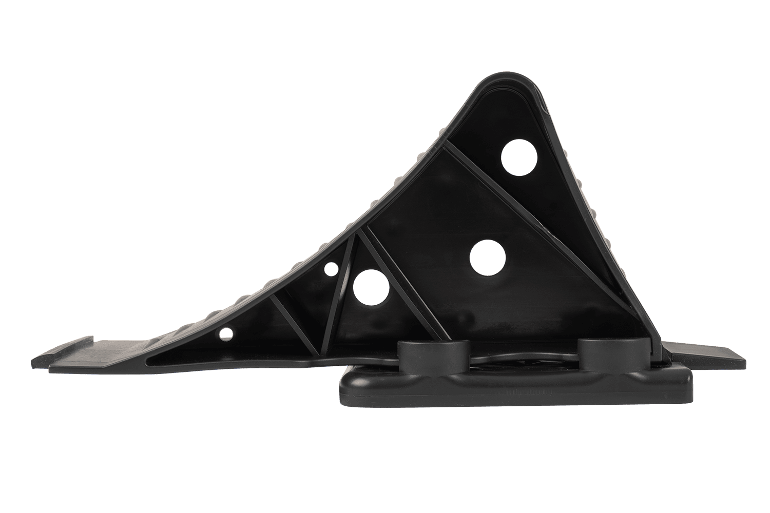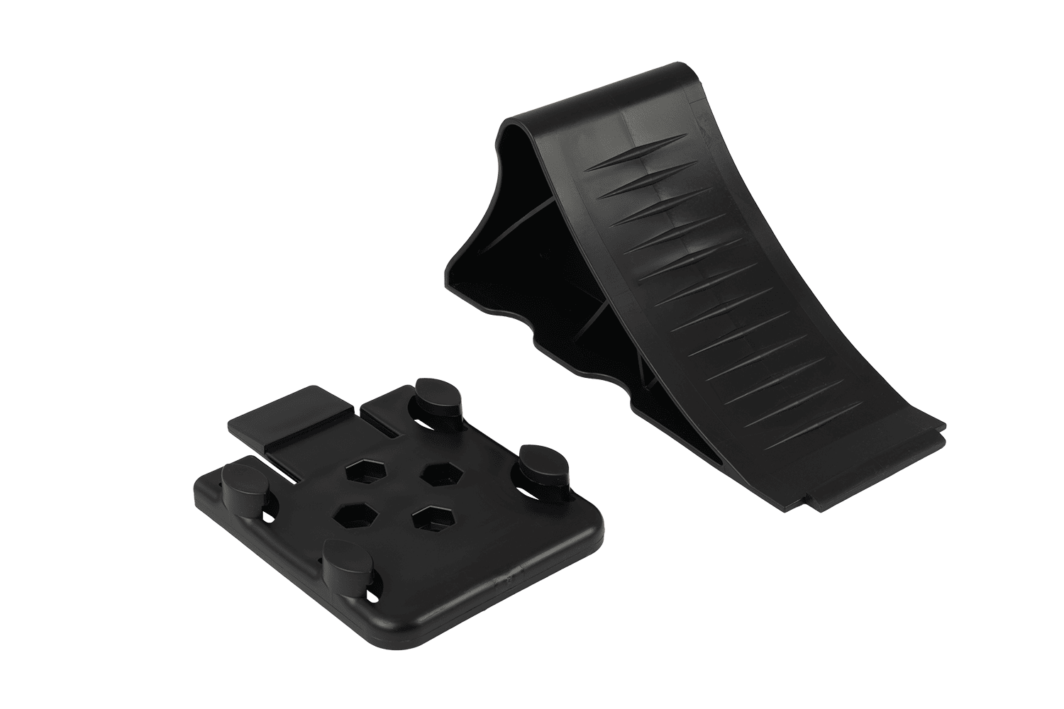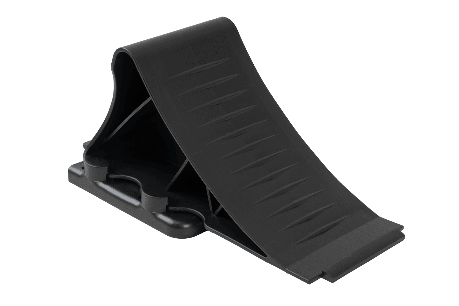 Fabricada en polipropileno negro de alta calidad , la cuña es significativamente más ligera que las cuñas metálicas tradicionales , lo que facilita su manejo y transporte. Gracias a su robusta construcción y perfil refinado, garantiza una inmovilización fiable del vehículo incluso en terrenos difíciles. Su forma ergonómica y tamaño compacto facilitan su uso y transporte.